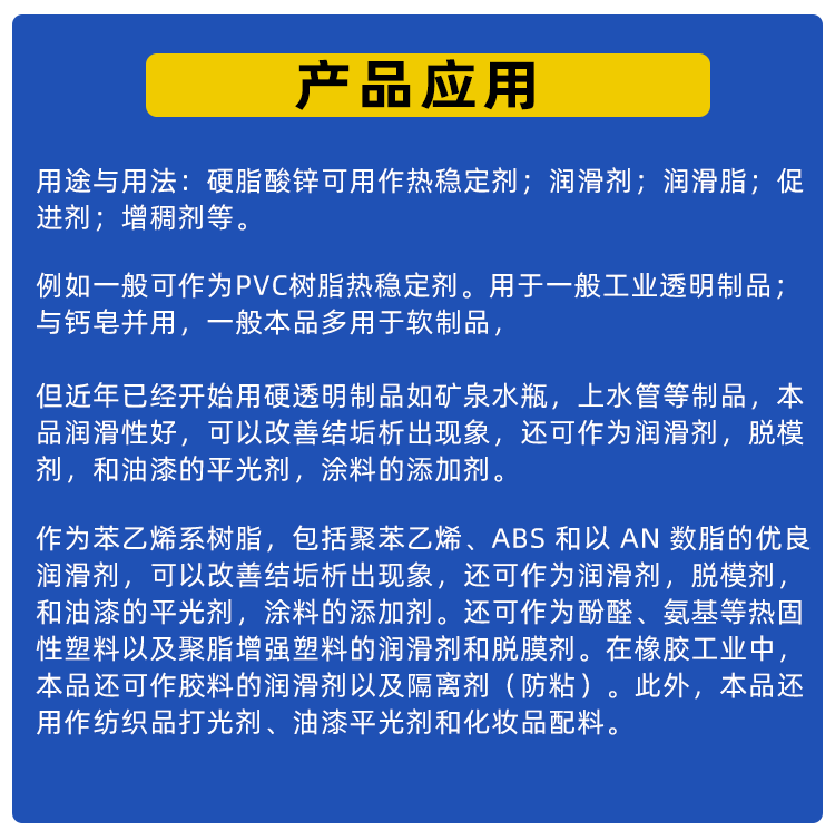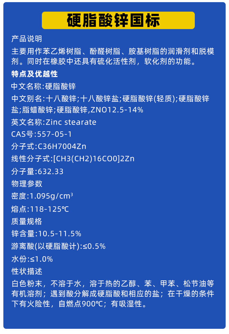 Национальный стандарт стеарат цинка (влажный метод); Стеарат цинка первого сорта (мокрый метод); Национальный стандарт стеарат цинка (сухой метод); Сингапурская стеариновая кислота San Yi (импортная, прозрачный сорт); [Новый процесс] Цинк-стеарат национального стандарта (B20)