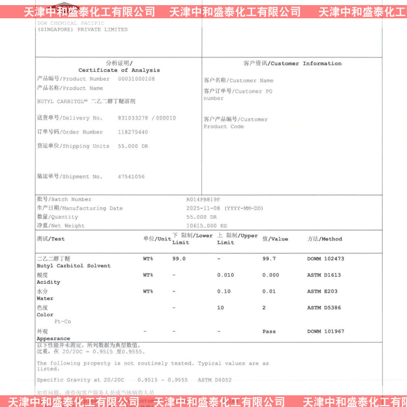 Диэтиленгликоль бутиловый эфир, диэтиленгликоль монобутиловый эфир, промышленный растворитель, содержание 99%, малый и большой антибеливящий эффект, DBG