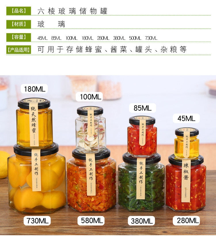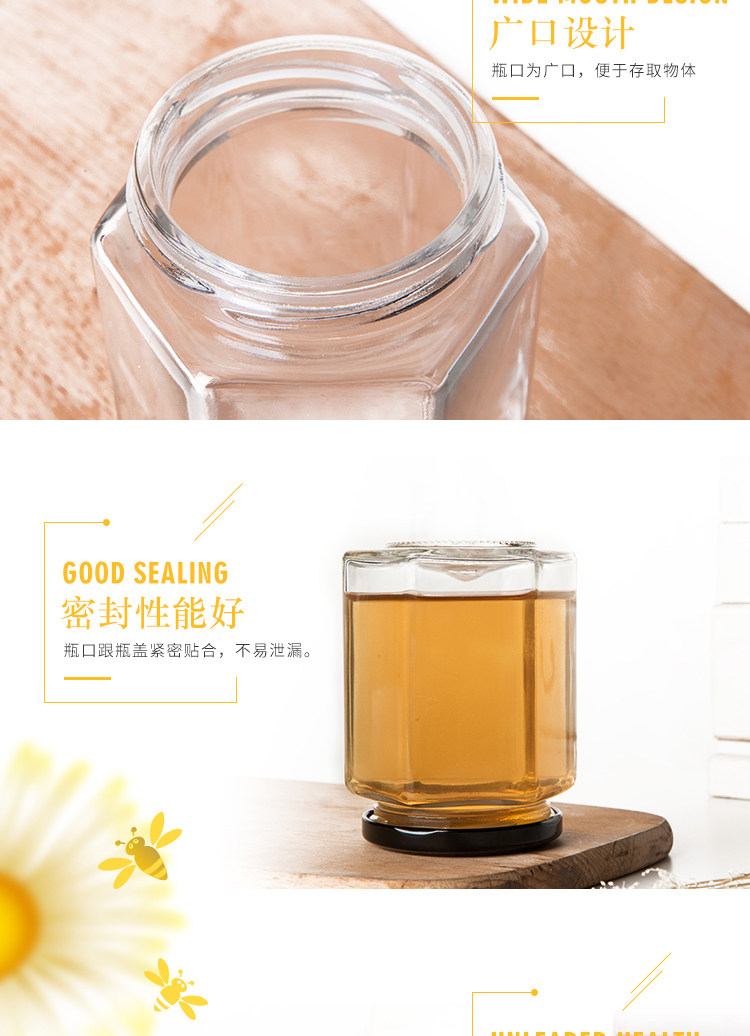 Оптовая продажа фунт меда бутылка из шестиугольного стекла бутылка герметичная бутылка для хранения маринада бутылка консервированного варенья бутылка с крышкой