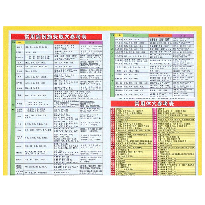 铜版纸双面印刷,背面《常用病例施灸参考表》《体穴参照表》《四穴养生法介绍》《艾灸注意事项》。