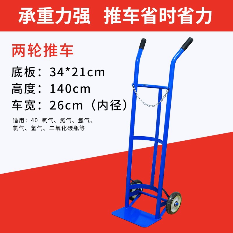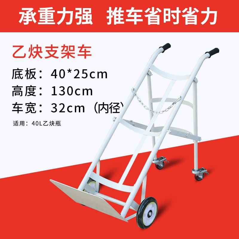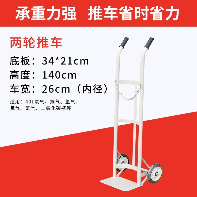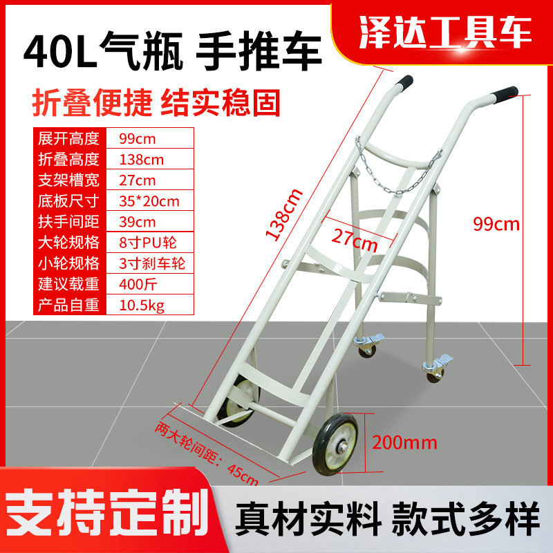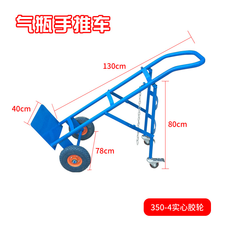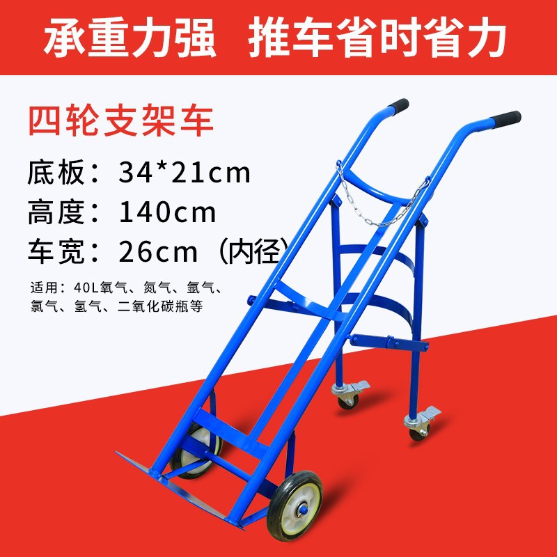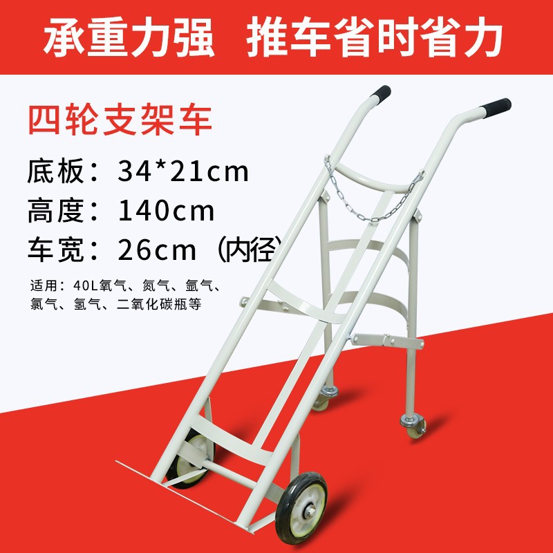 氧气瓶四轮手推车可折叠,使用起来方便易存储,适用于40L氧气/乙炔气瓶的搬运,整体焊接牢固可靠,无漏焊、焊瘤、焊疤、过烧、击穿等焊接缺陷。手推车配有防倒链条,长度可以调节,保证了气瓶搬运过程中的稳定。手推车有白色、蓝色、橘红色可选。