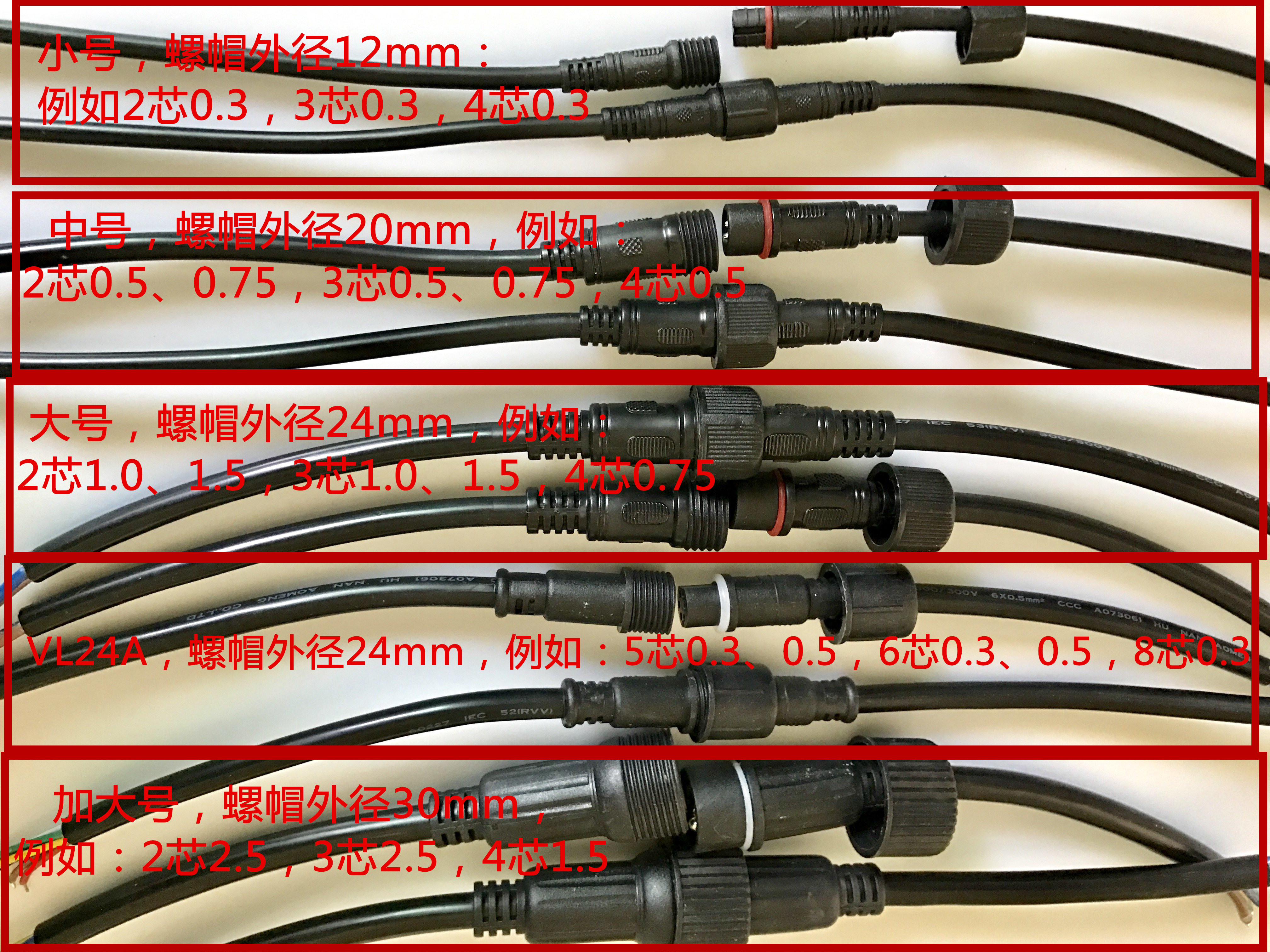 小号(螺帽外径12mm):2芯0.3, 3芯0.3, 4芯0.3