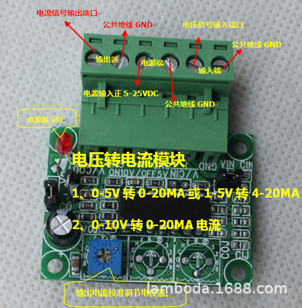 1、实现工业标准上的电压(0~5V、0~10V)转换工业标准上的电流(0~10mA、0~20mA)默认是输入0-5V,输出0-20MA,,也接受其它尺寸及其他线性关系的产品。