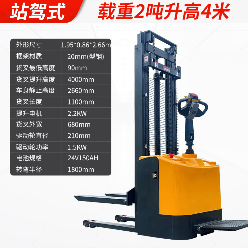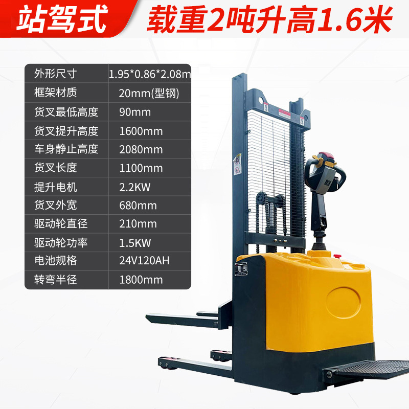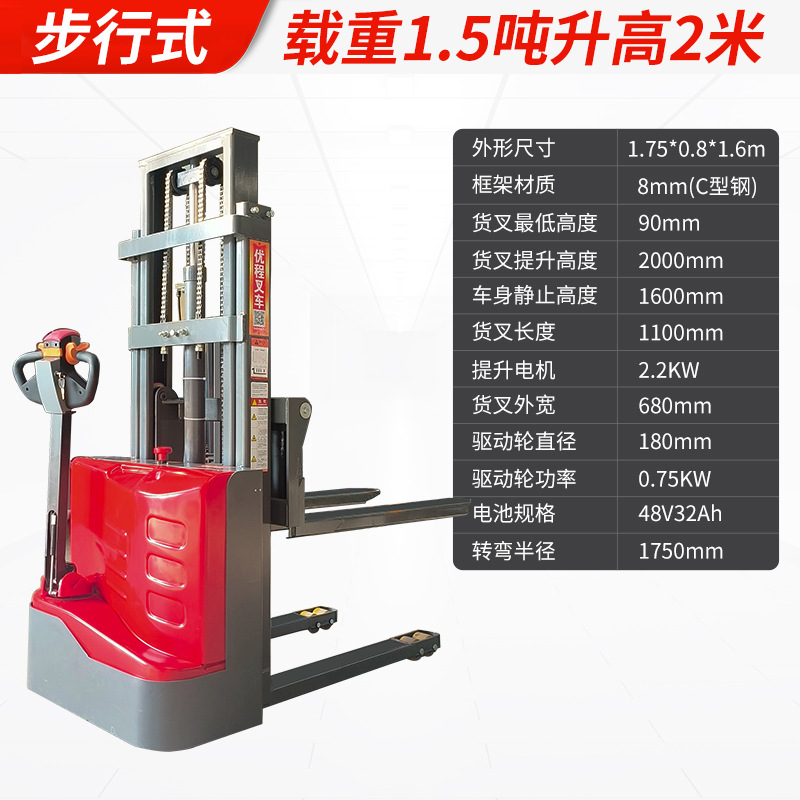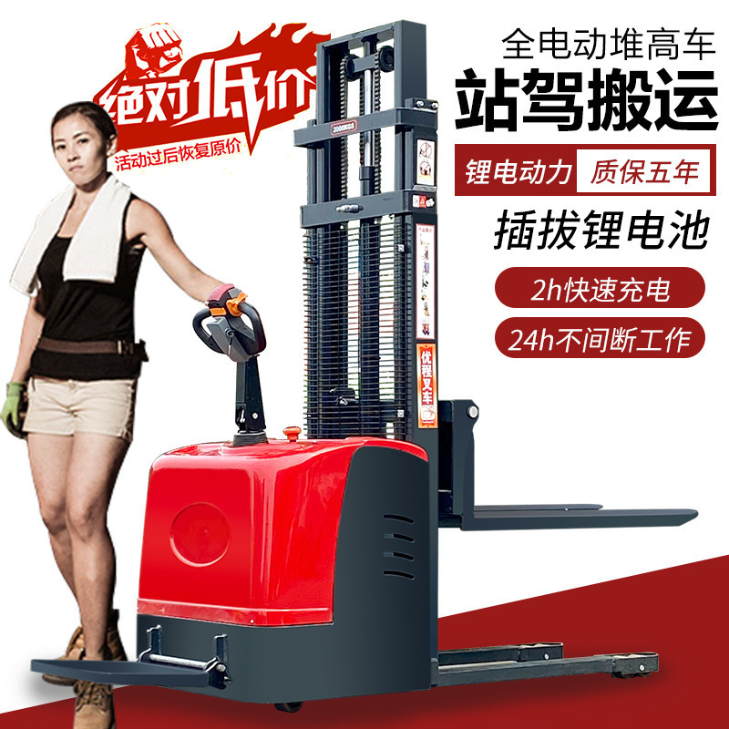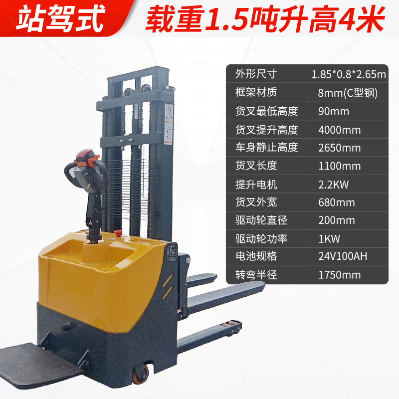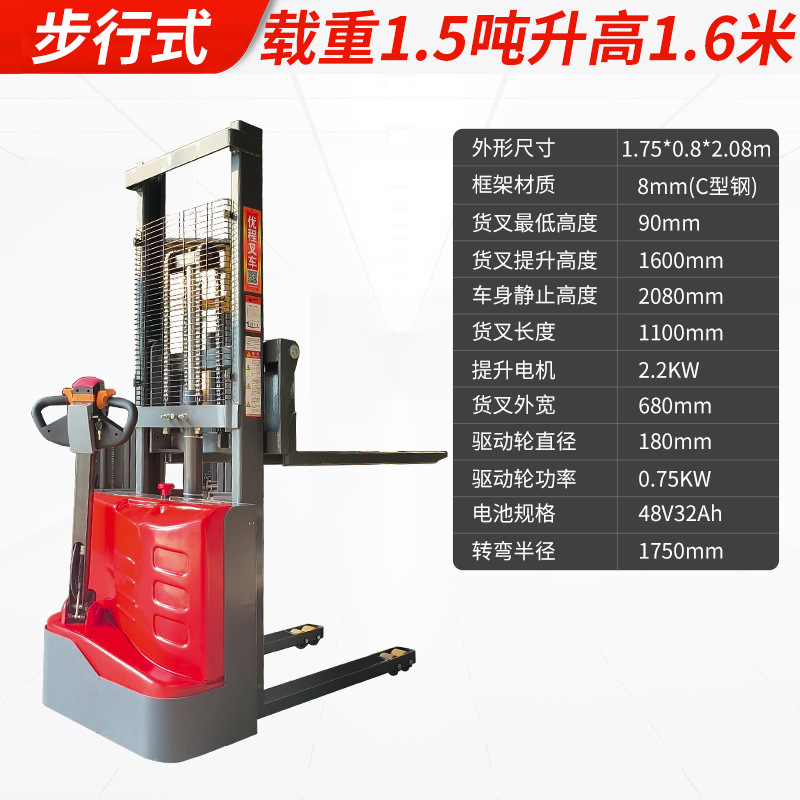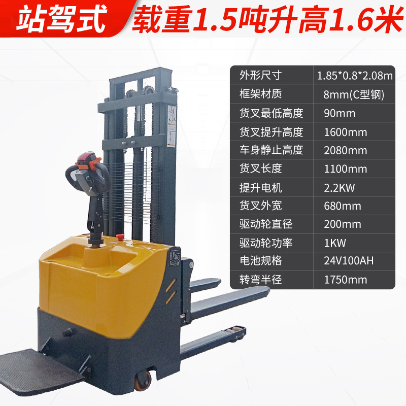Электрический штабелер грузоподъемностью 1,5 тонны, полностью электрический, с гидравлическим подъемом, для погрузки и разгрузки, с двумя аккумуляторами.