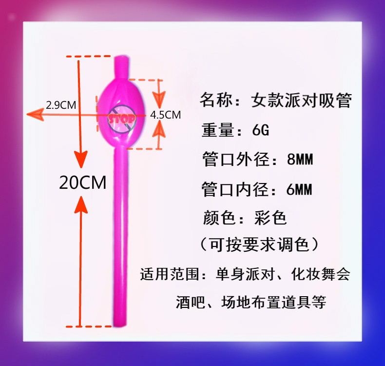 适用范围:朋友生日恶搞趣味礼品,酒吧、夜场、单身派对,KTV,情侣约会增添了特别的气氛等,是一款新潮也特别的新型吸管