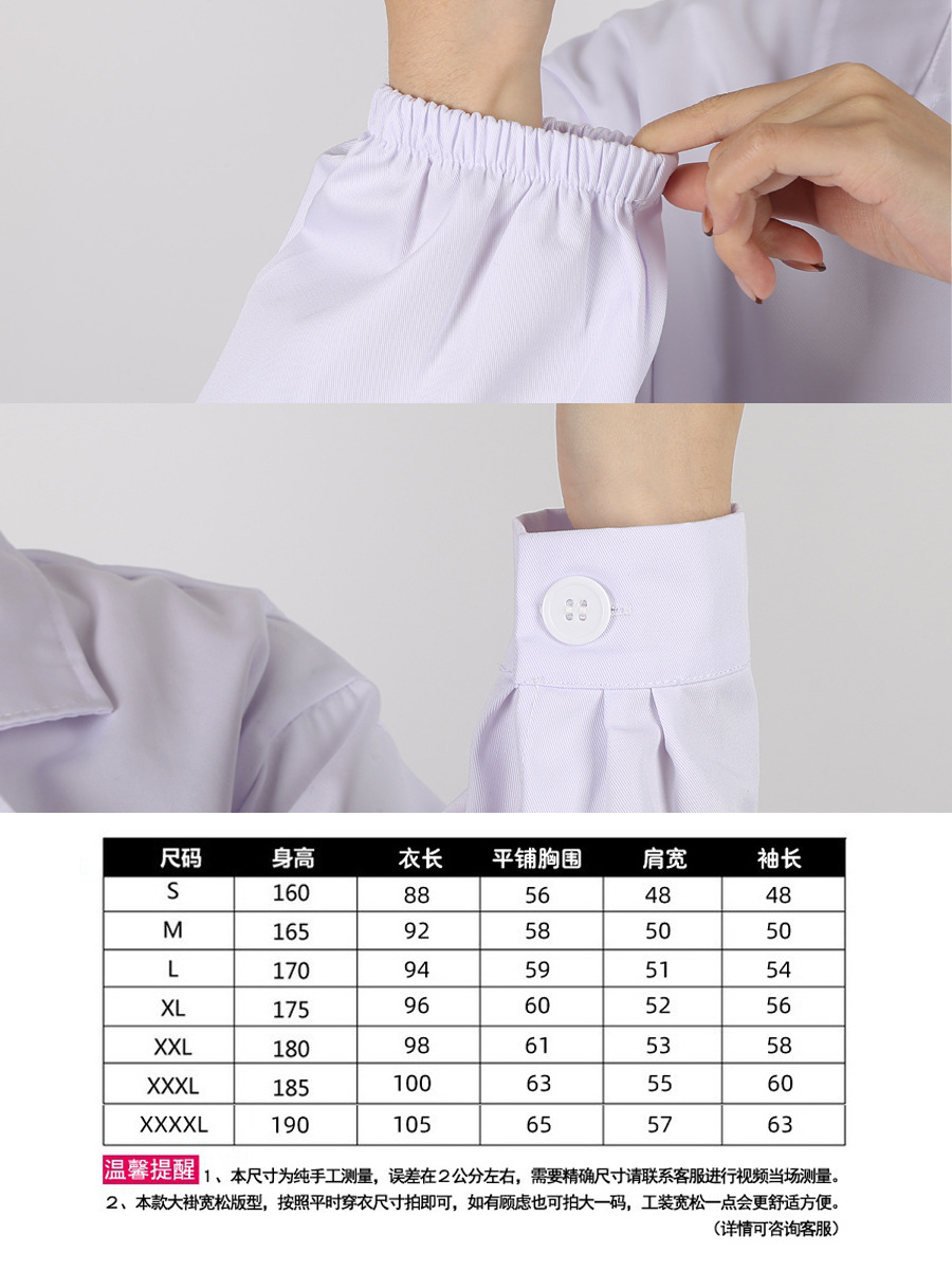 工作服为宽松直筒版型,按照平时穿衣尺码拍即可,平时穿M码衣服即拍L码。如果担心不合适可以拍大一码,拍大不拍小。穿大点工作时活动自如,比较方便。
