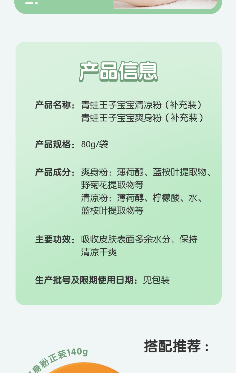 Пакетик для дозаправки детской присыпки 80 г (бесплатная доставка при заказе от 30 штук в магазине); 80 г детского охлаждающего и успокаивающего порошка (бесплатная доставка при заказе от 30 штук в магазине); 80 г детского кукурузного талька для пополнения запасов (бесплатная доставка при заказе более 30 штук в магазине); Коробочка детского талька 140г с пуховкой (бесплатная доставка при заказе от 30 шт. в магазине); Коробка с охлаждающим порошком для детей 140 г с пуховкой (бесплатная доставка при заказе от 30 штук в магазине); Детский лосьон 50 мл (бесплатная доставка при заказе от 30 штук в магазине); Детская туалетная вода-спрей 185 мл (бесплатная доставка при заказе от 30 штук в магазине); Детская успокаивающая палочка из окопника 8г (бесплатная доставка при заказе от 30 штук в магазине)