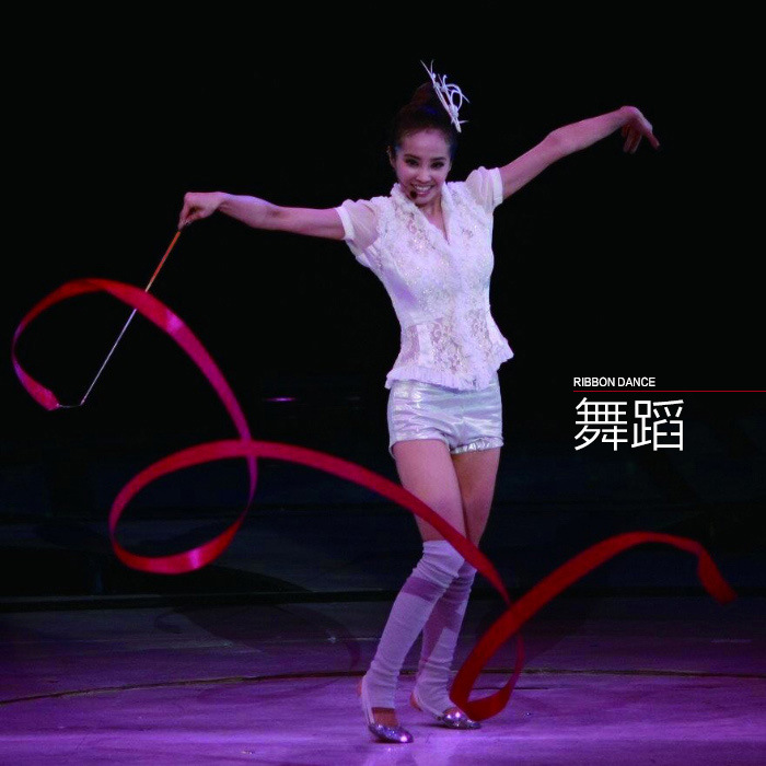 【材料】:标准专业艺术体操彩带,面料采用新材料丝绸面料制作, 手棒采用玻璃纤维钢制作,手握带防滑设计。