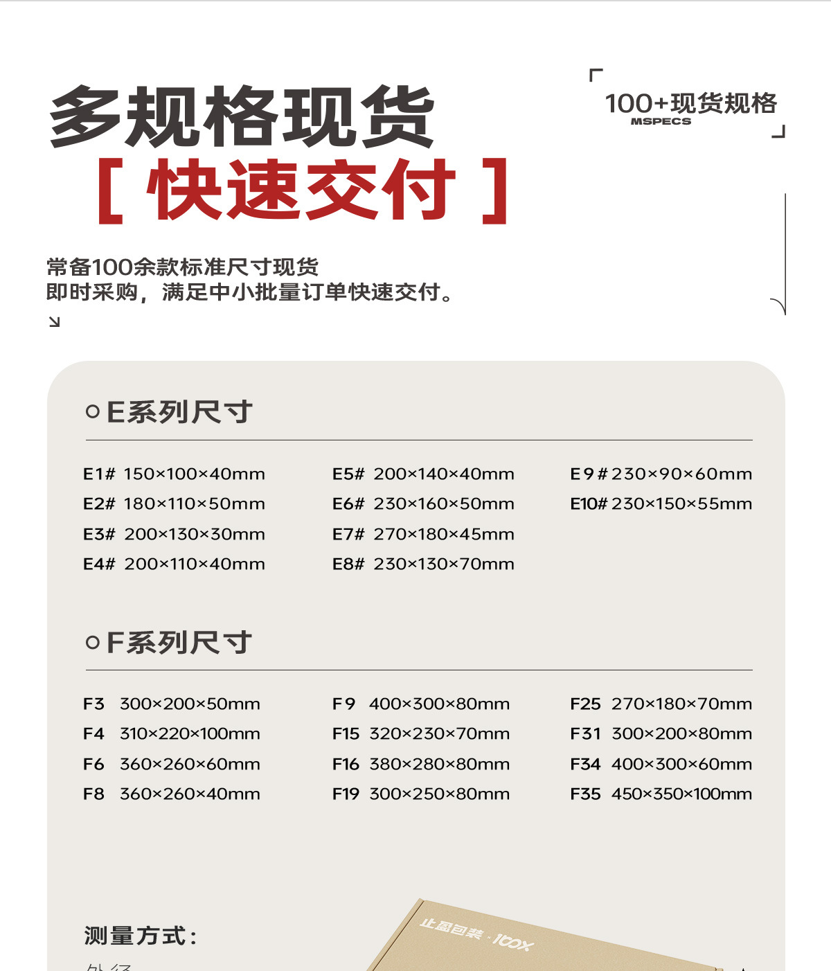 F4(310*220*100); E1(150*100*40mm); E2(180*110*50mm); E3(200*130*30mm); E4(200*110*40mm); E5(200*140*40mm); E6(230*160*50mm); E7(270*180*45mm); E8(230*130*70mm); E9(230*90*60mm); E10(230*150*55mm); F3(300*200*50mm); F6(360*260*60mm); F8(360*260*40mm); F9(400*300*80mm); F15(320*230*70mm); F16(380*280*80mm); F19(300*250*80mm); F25(270*180*70mm); F31(300*200*80mm); F34(400*300*60mm); F35(450*350*100mm); E11(150*150*50mm)
