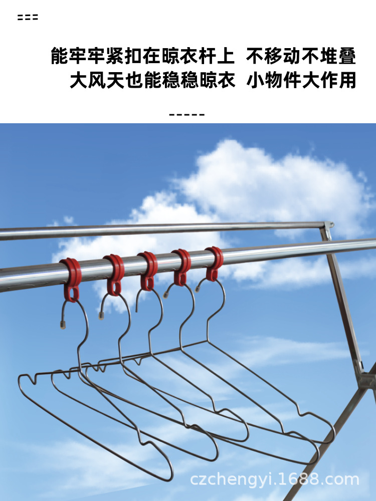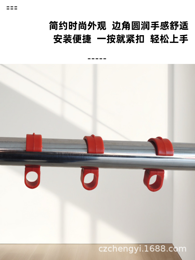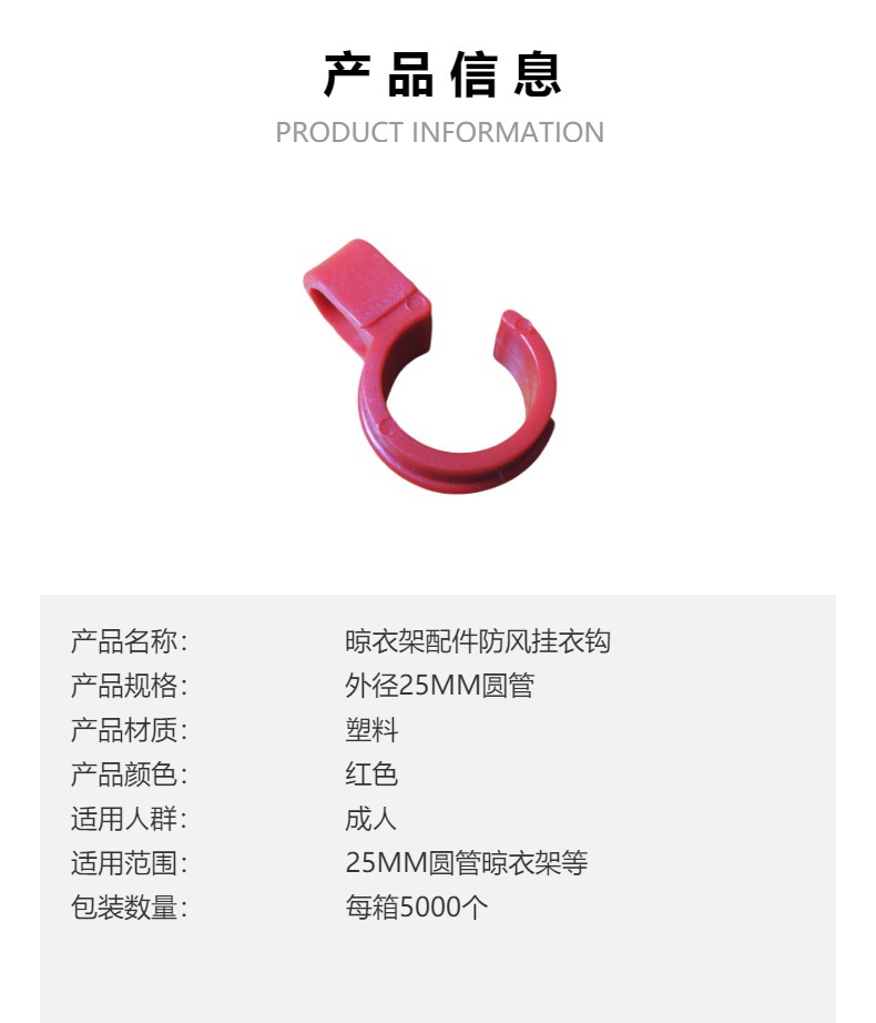 本款产品的规格是25MM圆管落地式X型折叠晾衣架配件,采用优质的塑料原料注塑成型,韧性高,弹力好,使用方便,能牢牢地扣紧在25MM圆管上,再挂上衣架,任凭风吹衣架也不会移动,衣物更容易晾干,晾晒衣物更方便,安全放心。防风挂衣钩确实是X型落地式折叠晾衣架的“黄金搭档”!