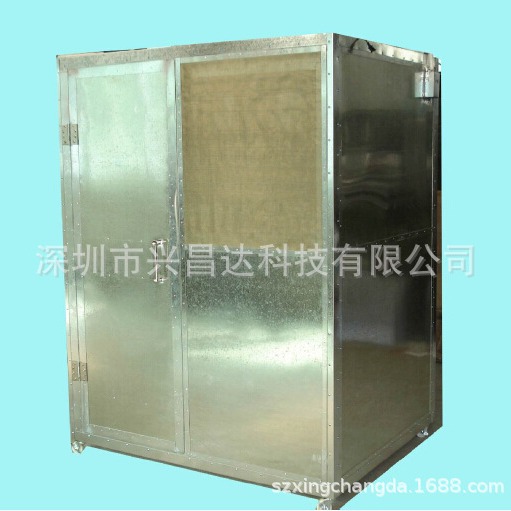 用25*25*1.0和25*50*1.0镀锌扁通焊接成框架形状,四周用0.5MM厚镀锌板密封,门采用方通及镀锌板作双层框架,配进口铍铜弹片包四周,以增加碰触面及屏蔽效果,门侧上半部分别为8层屏蔽网,表面一层为铁网,内部为铜网,以免碰穿,起到保护作用,同时网的部份也可以用来做透视窗,铜网与镀锌板拼装;屏蔽房顶部安装30*30金铃排气扇;地面用1.5cm厚夹板作地板,贴12"*12"*1.2MM阻燃地板胶。屏蔽房底部安装可移动轮子,带刹车;安装方便,可移动,可拆迁,双层结构。