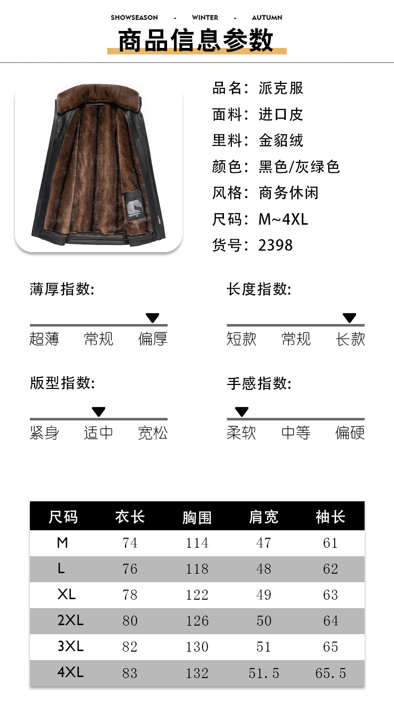 М/170; Л/175; XL/180; 2XL/185; 3XL/190; 4XL/195; Долгосрочное массовое производство, большое количество товаров; Съемный меховой воротник, съемная подкладка.