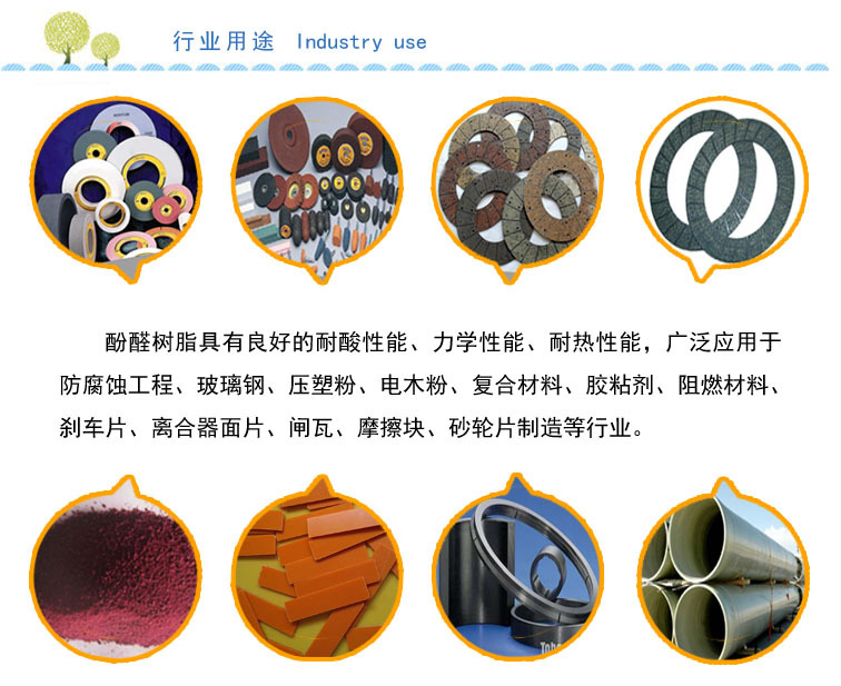Фенольное стекловолокно, фенольный цемент, дерево, бамбук, судостроение, электроприборы, лампочки, щетки, шлифовальные круги и другие промышленные клеи.