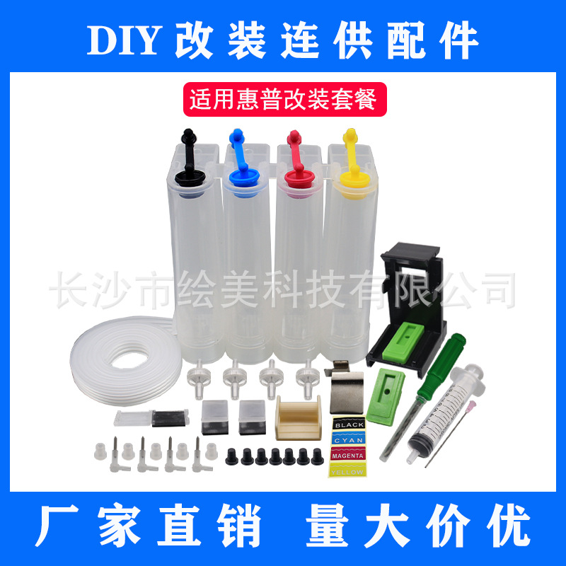 配件包含:连供外置瓶带管线1套,钢针弯头4个,密封胶圈各5个,小黑塞7个,空气过滤塞4个,加墨工具1个,U型管线夹2个 ,平板夹1个,吸墨夹1个,手钻1个,L型管线夹1个,止水阀开关1个。(不含墨水,不含墨盒)