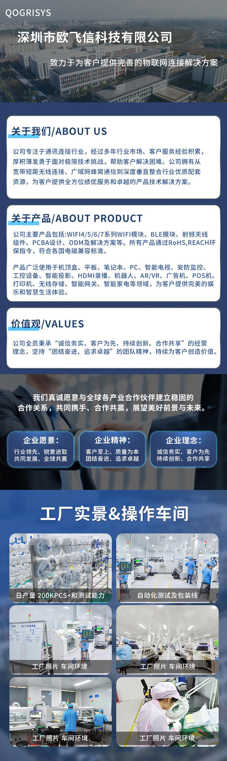 我司WIFI模块产品包含WIFI4、WIFI5、WIFI6、WIFI7高中低,2.4/5/6G三频全场景覆盖,具备配套天线与PCBA设计及ODM能力,并有蓝牙模块、AIOT模块、PLC模块等通讯连接类模块。