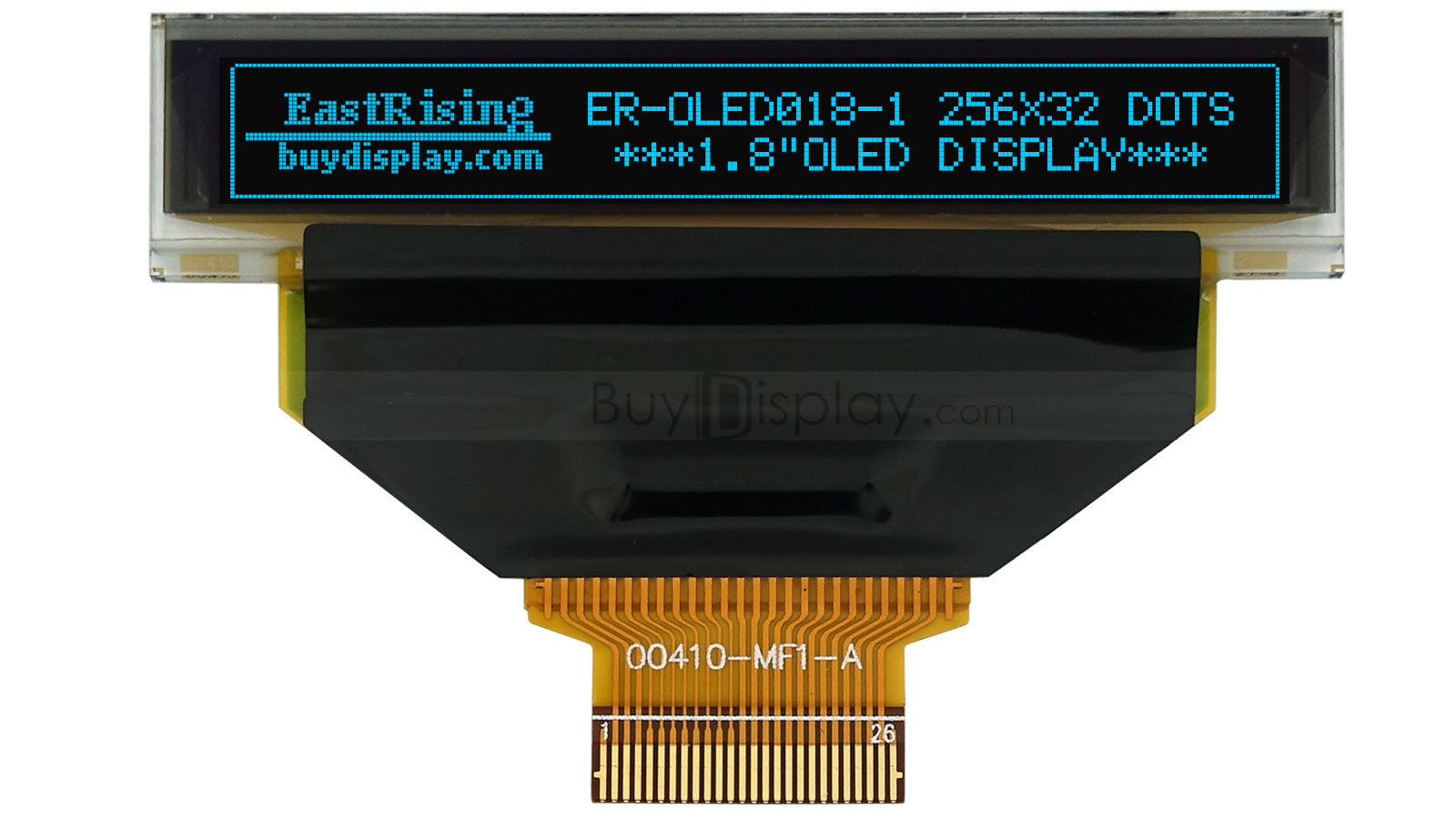 ER-OLED018-1B是一款显示蓝色字体的1.8寸OLED显示屏.256x32点阵,SSD1326控制器,6800/8080 8-bit并行接口和 I2C,3线/4线SPI串行接口,2.8V电压,OLED自身发光不需要背光的特性使其具有超薄,低功耗,超高对比度与视角,工作温度-40℃~85℃。FPC连接,(可选配连接器),所有材料均符合环保要求RoHS标准,此款模块广泛应用于各式仪器仪表、智能设备等,适用于多种单片机开发平台如8051、PIC、AVR、ARDUINO、ARM和树莓派Raspberry Pi等。