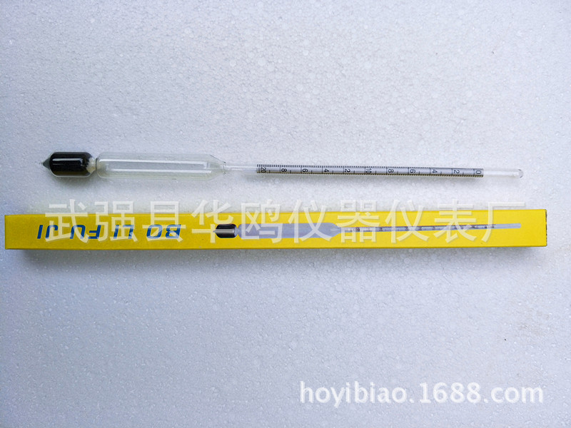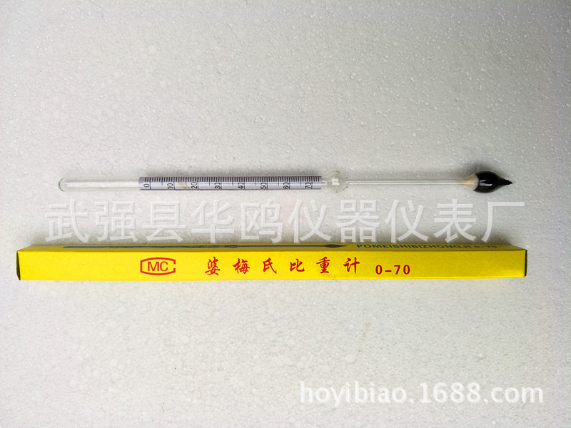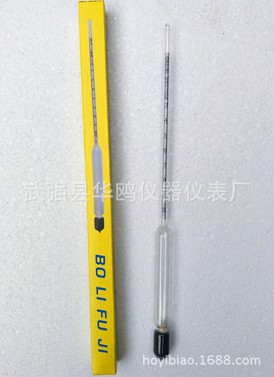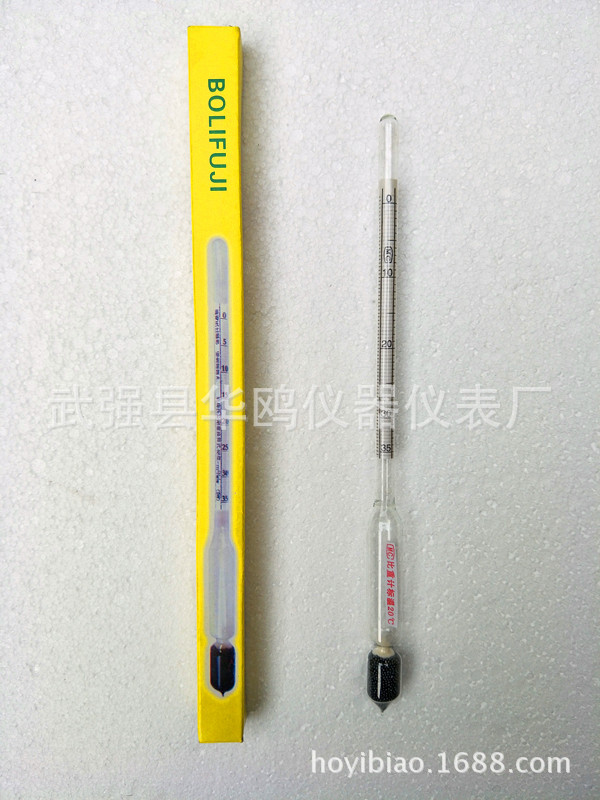 比重计是根据阿基米德定律和物体浮在液面上平衡的条件制成的,是测定液体密度的一种仪器。它是一根密闭的玻璃管,一端粗细均匀,内壁贴有刻度纸,刻度不均匀,上疏下密,另一头稍膨大呈泡状,泡里装有小铅粒或水银,使玻璃管能在被检测的液体中竖直的浸入到足够的深度,并能稳定地浮在液体中,也就是当它受到任何摇动时,能自动地恢复成垂直的静止位置。当比重计浮在液体中时,其本身的重力跟它排开的液体的重力相等。于是在不同的液体中浸入不同的深度,所受到的压力不同,比重计就是利用这一关系刻度的。