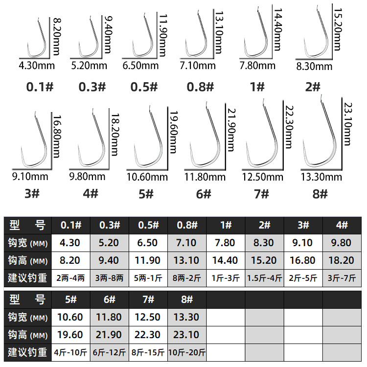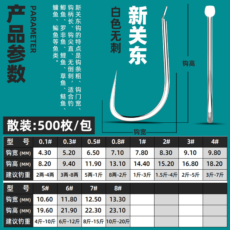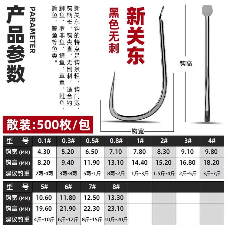 说明:散装鱼钩500枚/包,单个型号请以500枚的倍数下单,否则无法发货!