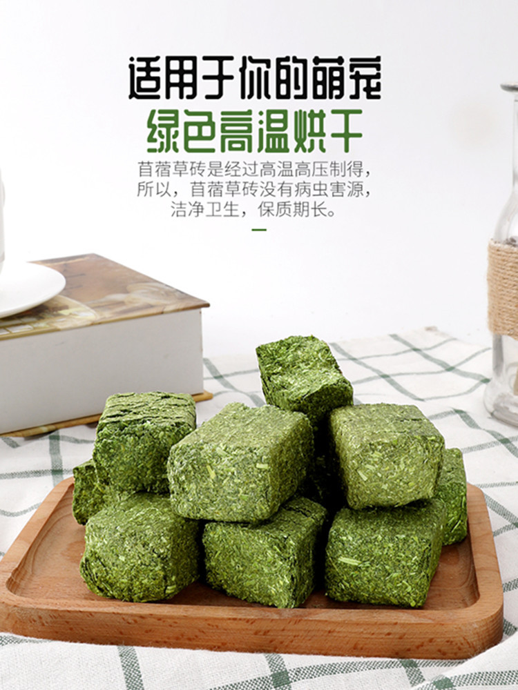 紫花苜蓿草,还可以压制成草砖,供龙猫,兔兔磨牙,啃食。由于苜蓿草砖是经过高温高压制得,所以,苜蓿草砖没有病虫害源,洁净卫生,保质期长。