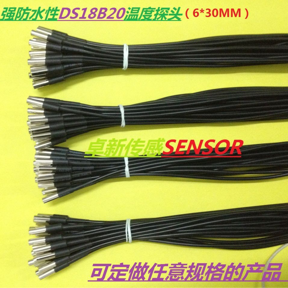我公司生产的温度探头全部采用美国美信公司原装DS18B20芯片,质量保障。304不锈钢管封装 ,强防水, 防潮,防性能腐蚀性能,常用规格有6*25MM,6*30MM,6*50MM,另有带螺纹型外壳,扁型壳体,线耳