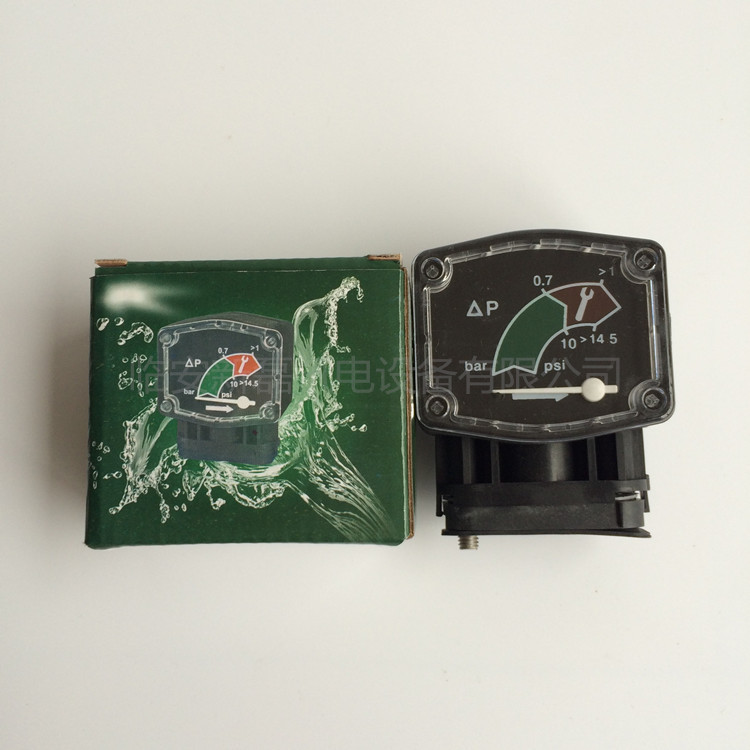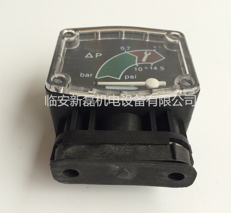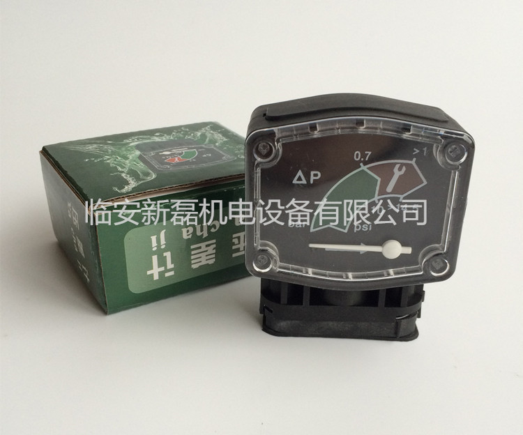 压差计:塑料外壳,1/4"管螺纹接口,非常方便用软管连接到中压以下压缩空气过滤器上,专门的颜色区间设置,便于提醒用户更换滤芯时间。最高工作压力10bar(1.0Mpa)。