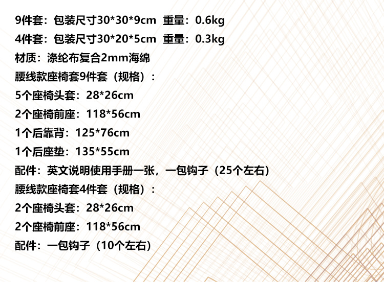 Комплект из 9 предметов (полный комплект из пяти мест); Комплект из 4 предметов (два сиденья); Комплект из 2 предметов (одноместный); Комплект из 5 предметов (отдельное заднее сиденье)