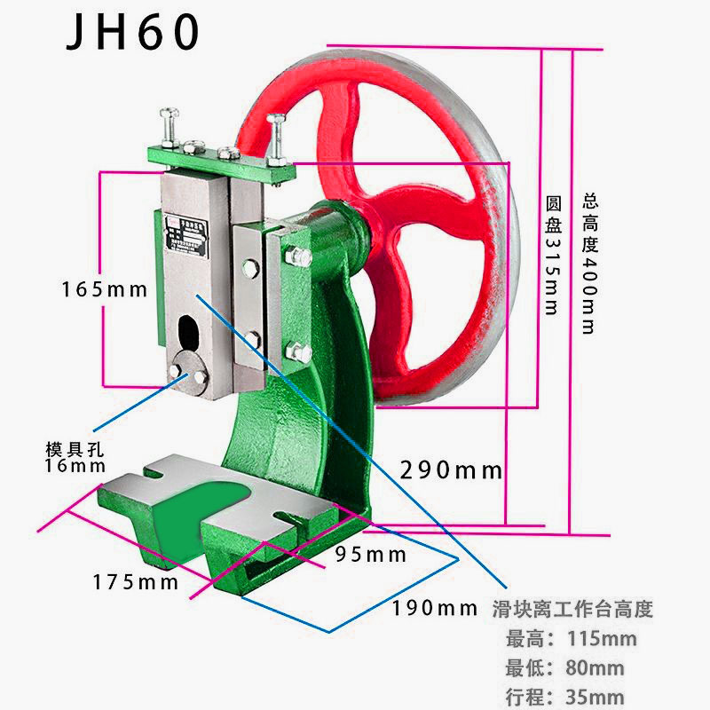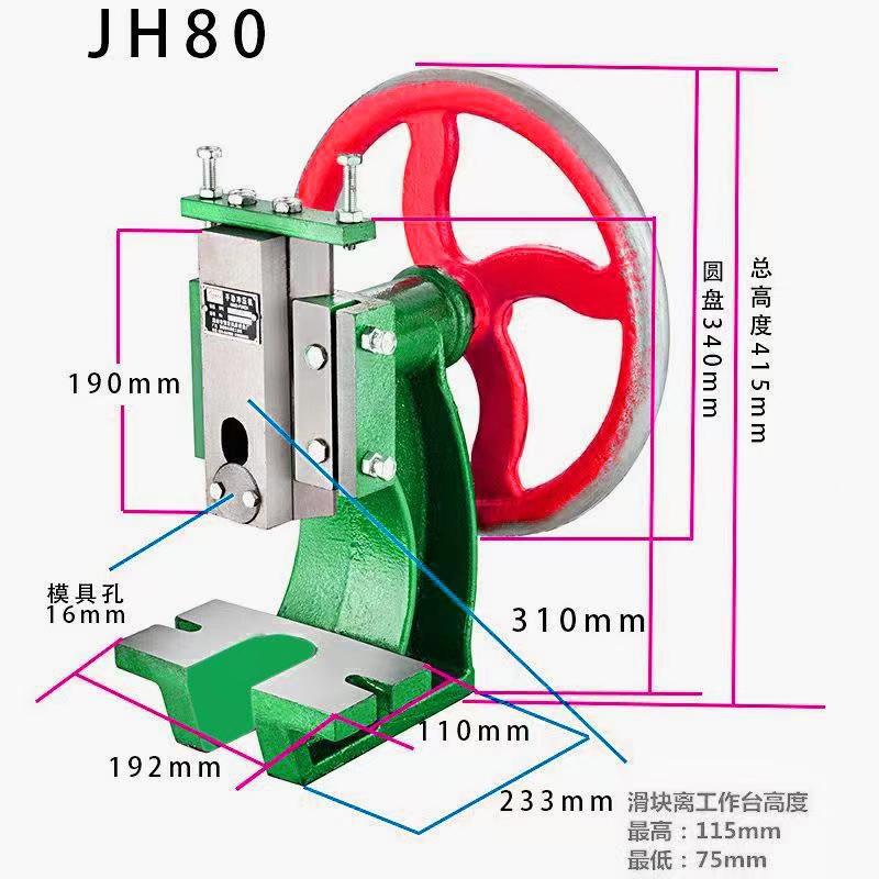 JH系列手动冲床,外形迷你,操作简单,直接转动方向盘式手轮冲压,用户根据需要可配套不同模具操作于不同的产品。主要用于冲压、折弯、冲孔、铆合、剪切、 弯曲、断裂、缩口、拉伸、矫平等…