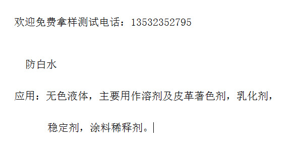 Применение: Бесцветная жидкость, в основном используется в качестве растворителя и красителя для кожи, эмульгатора, стабилизатора, разбавителя краски.
