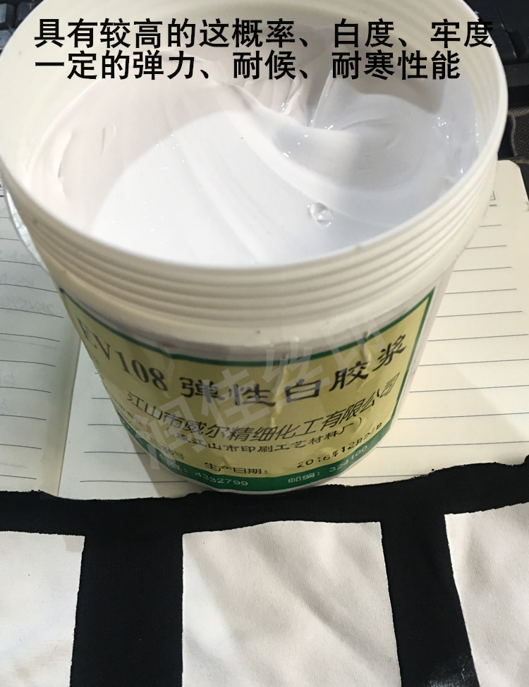 白胶浆和透明胶浆可以看成好搭档,白胶浆遮盖好,透明胶浆弹性好且调出颜色正,印浅色衣服直接用透明调,印深色衣服用白胶浆遮盖