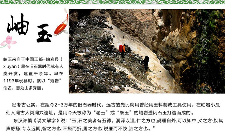 【材 质】绿凤玉 【尺 寸】7×4.5cm×0.4cm (手工量测、以实物为准) 【重 量】25g±5g 【支 持】定做、logo刻字 【工 艺】做工精细,精工打磨,油润光洁。 【产 地】中国玉都·辽宁岫岩 【发 票】本公司可开发票,需开发票另外交税。 【买家必读】天然玉石的颜色、絮状物、纹理、大小都会有些许不同,均以实物为准。俗话说:“十玉九棉,十玉九纹”。玉器界有句行话叫“天有云,玉有纹”!玉器属于特殊商品,天然的东西是很少能达到很美的,尤其是天然玉器,其内部、表面显现的棉、筋、纹及杂色等都是自然之美,是鉴别真伪的重要依据,不属于瑕疵范畴。天然的玉石不可能象人造玻璃那样美,这也正是天然玉石价值的体现。追求完美的朋友请慎重。 |