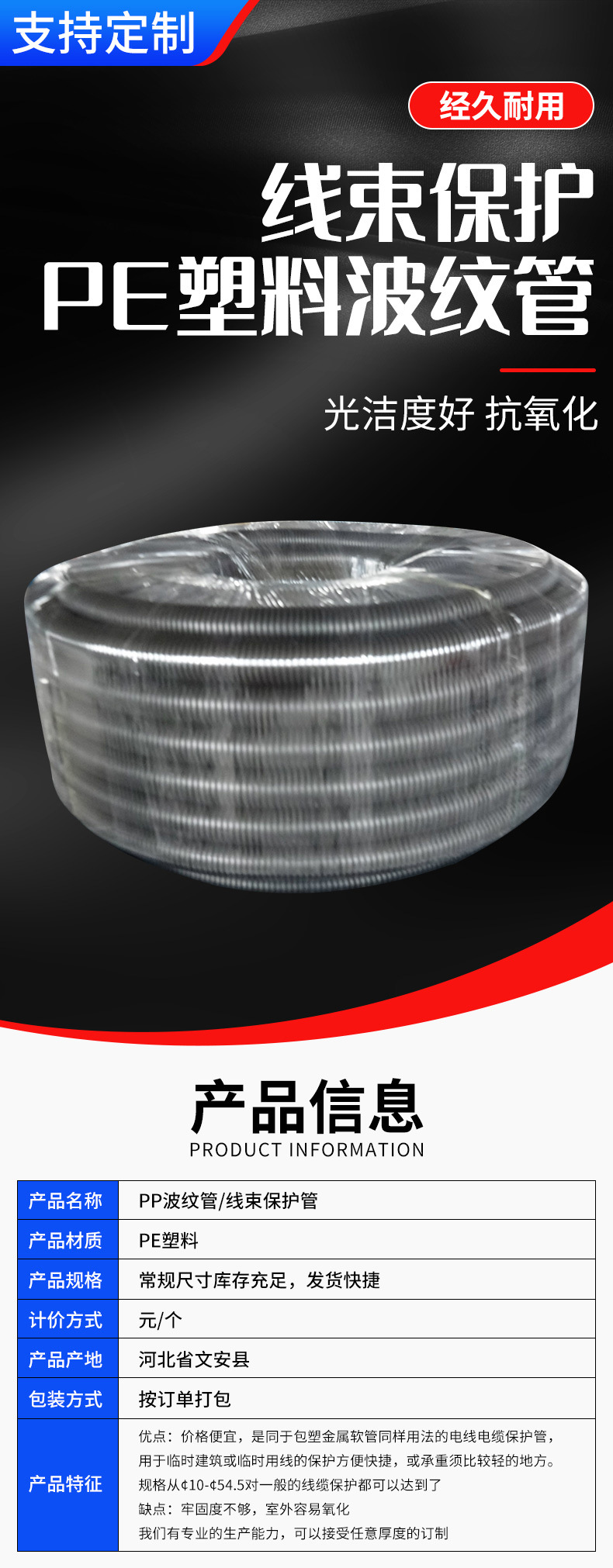 Гофрированная труба ПЭ 10 (4000m шт/уп); Гофрированная труба ПЭ 13 (2000m шт/уп); PE сильфон 15.8(1760 м/пакет); PE сильфон 18.5(1280 м/пакет); PE сильфон 21.2(1280 м/пакет); PE сильфон 25(800 м/пакет); PE сильфон 28.5(560 м/пакет); PE сильфон 34.5(720 м/пакет); PE сильфон 42.5(360 м/пакет); PE сильфон 54.5(280 м/пакет); PE сильфон 67,2 (140 м/пакет); PE сильфон 80(120 м/пакет); PE сильфон 108(100 м/пакет)