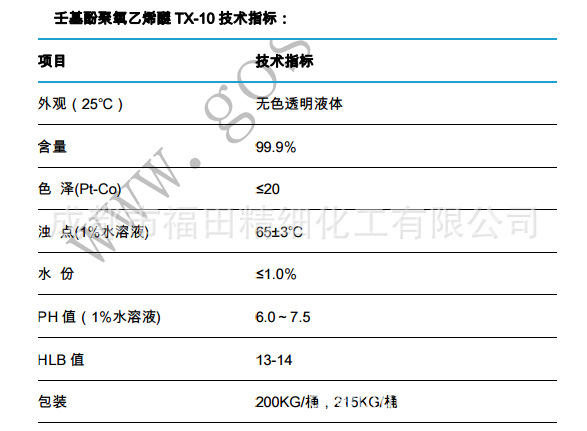1、TX-10 易溶于水,耐硬水和强碱,具有极好的渗透、乳化、分散和洗涤性能;