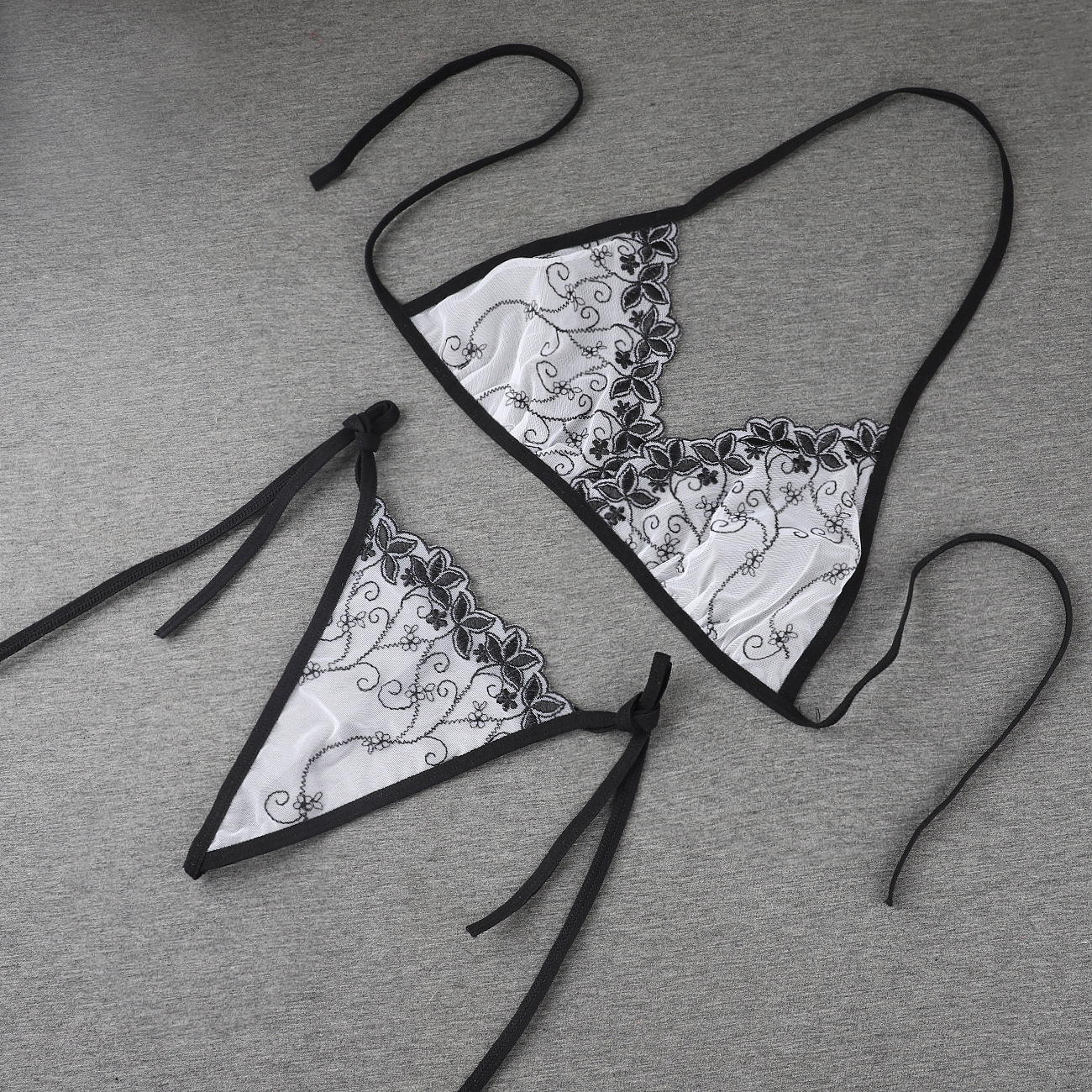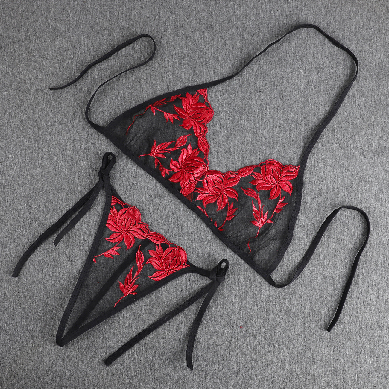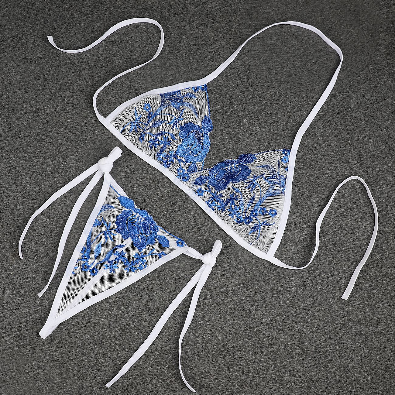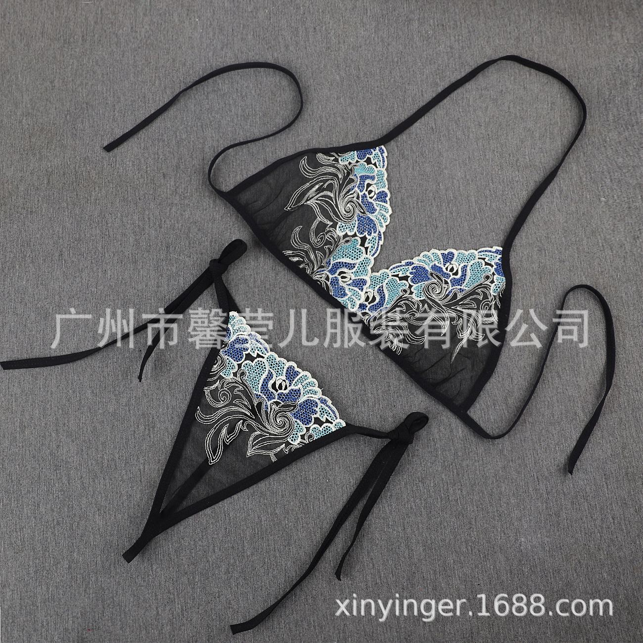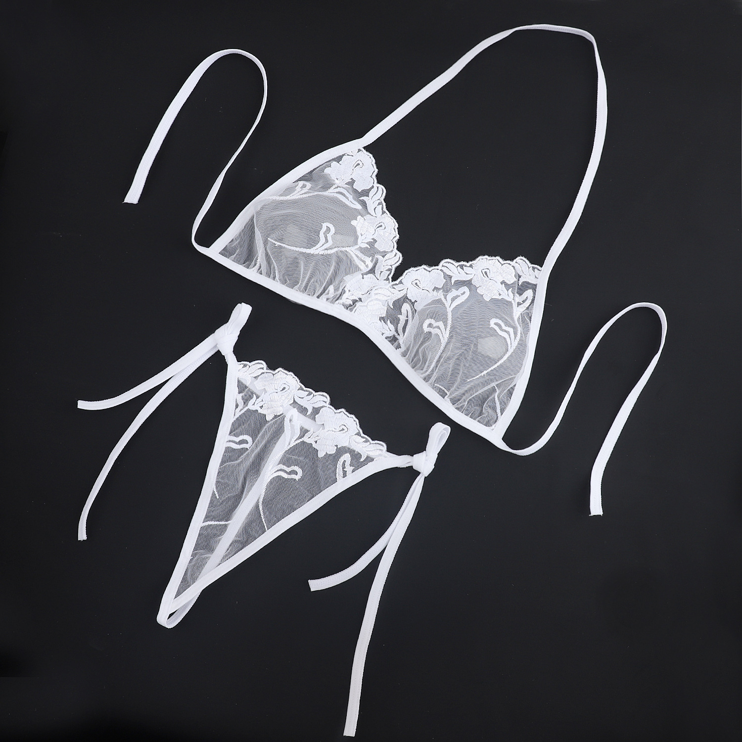 Трансграничная фабрика нового продукта Вышивка Цветочная забавная трехточечный костюм Прозрачный сетчатый ремешок Нижнее белье