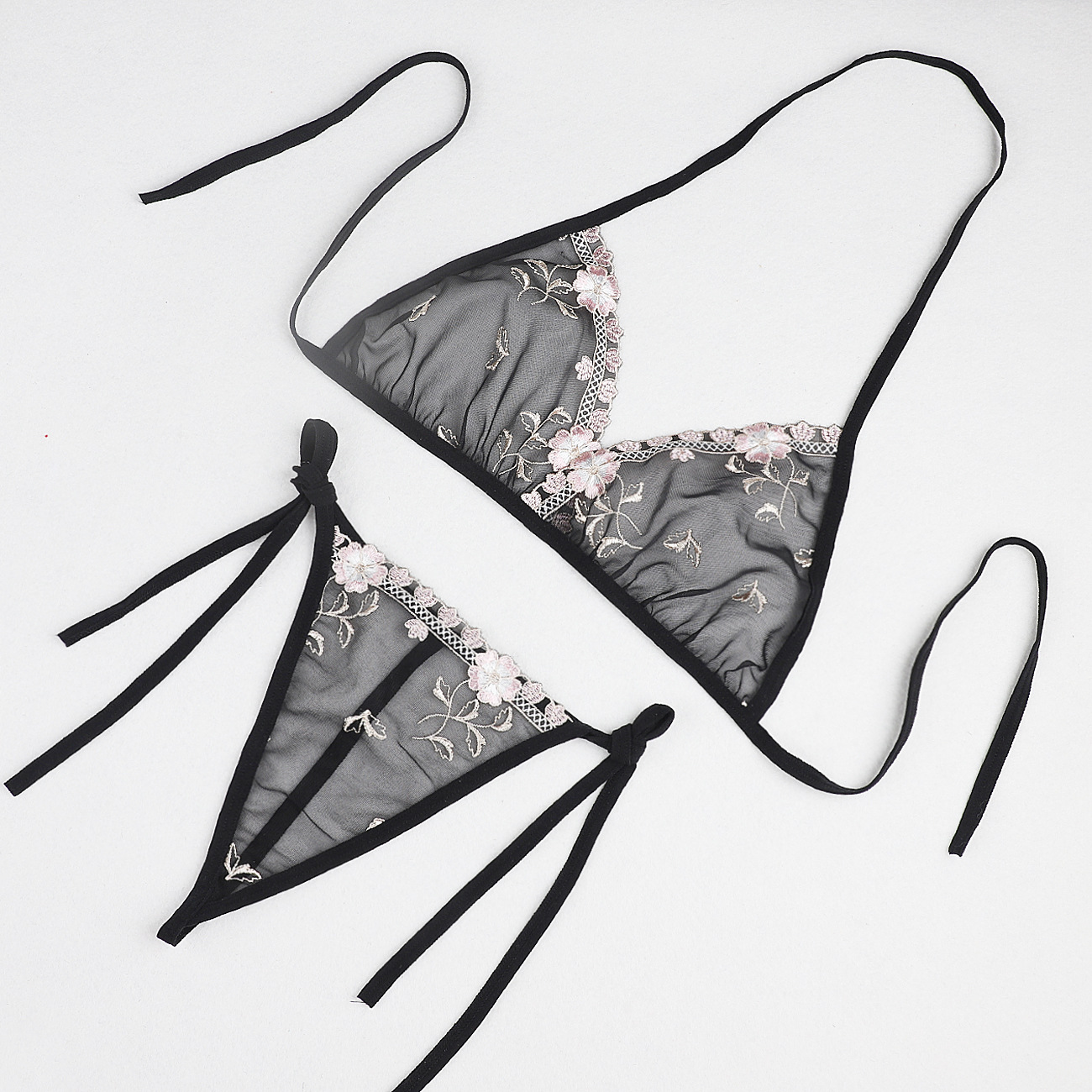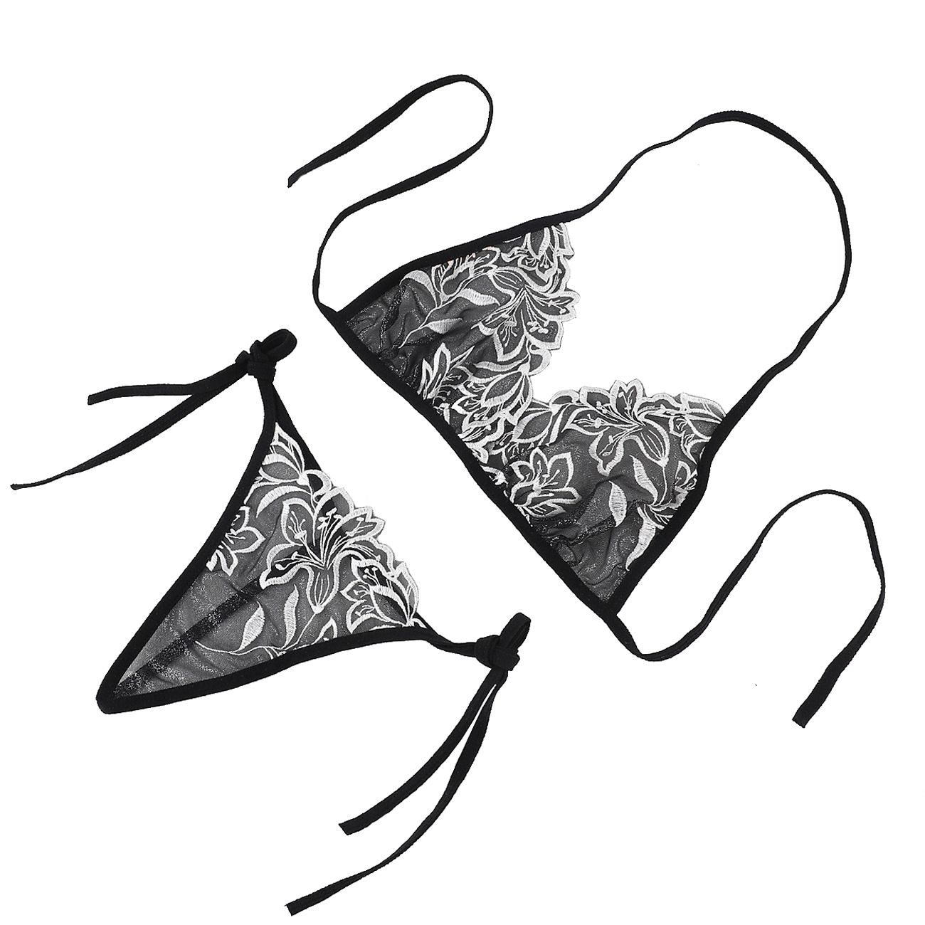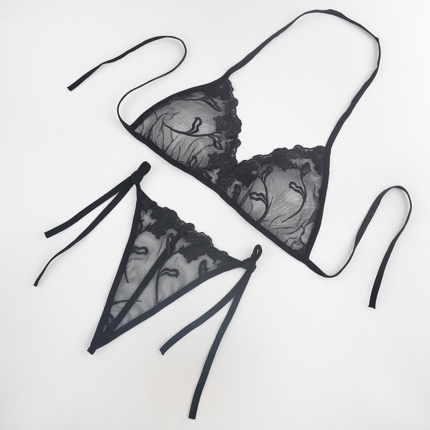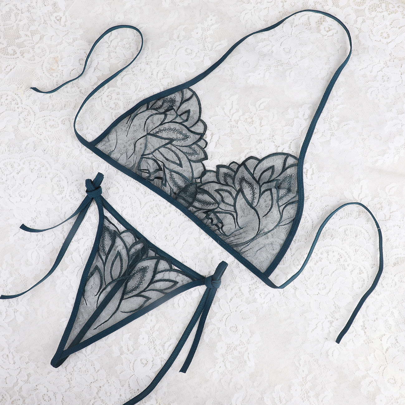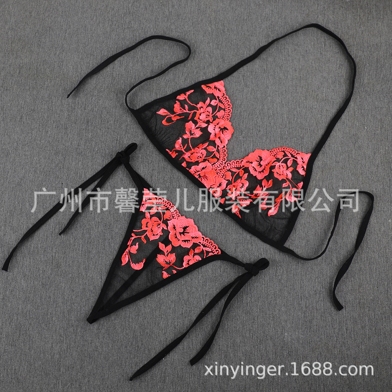 Трансграничная фабрика нового продукта Вышивка Цветочная забавная трехточечный костюм Прозрачный сетчатый ремешок Нижнее белье