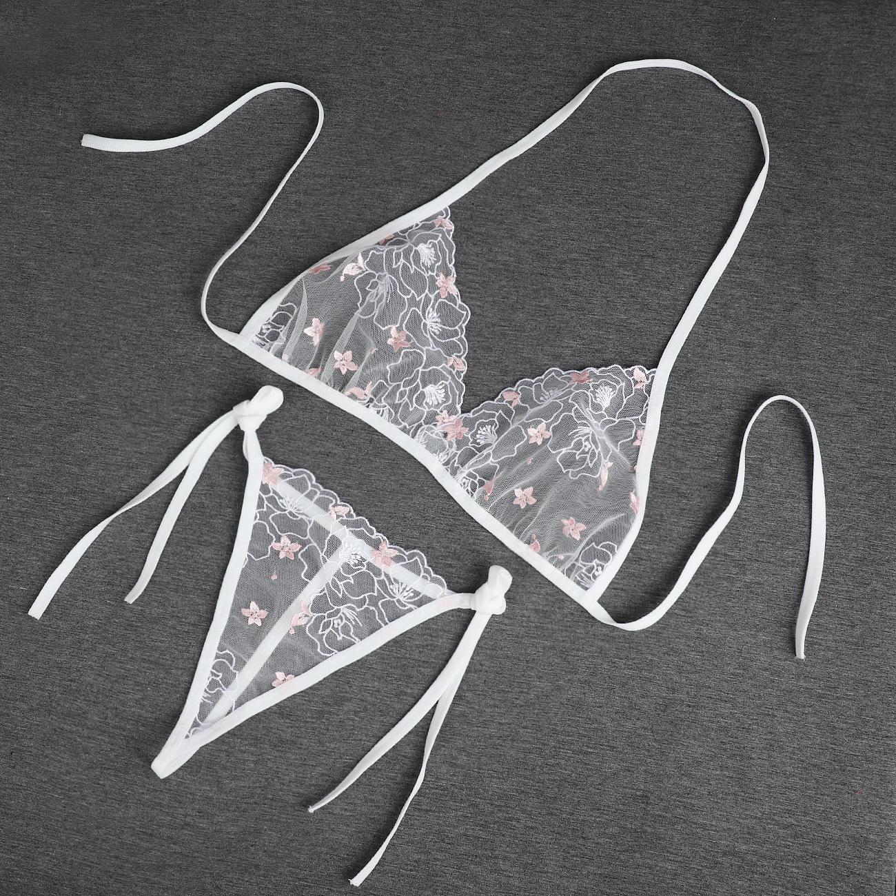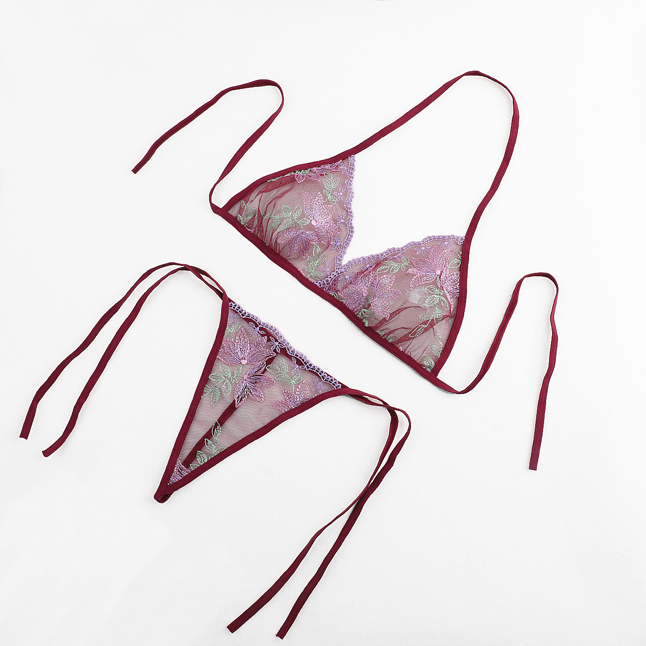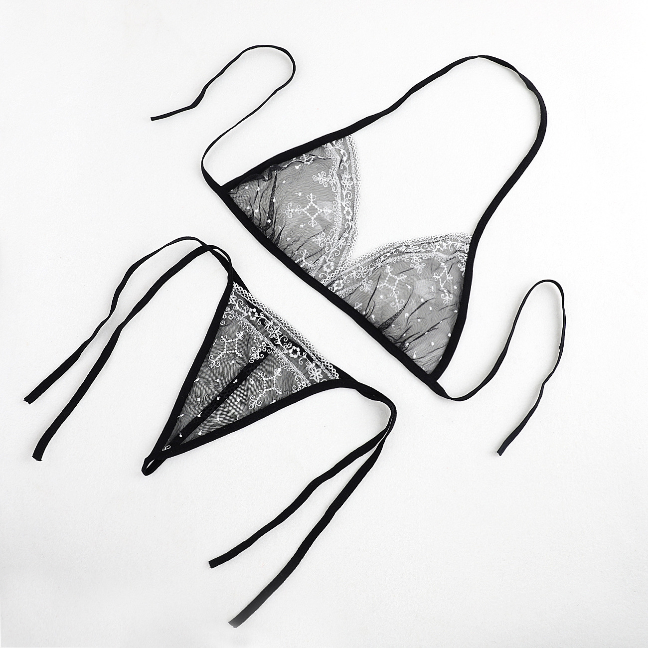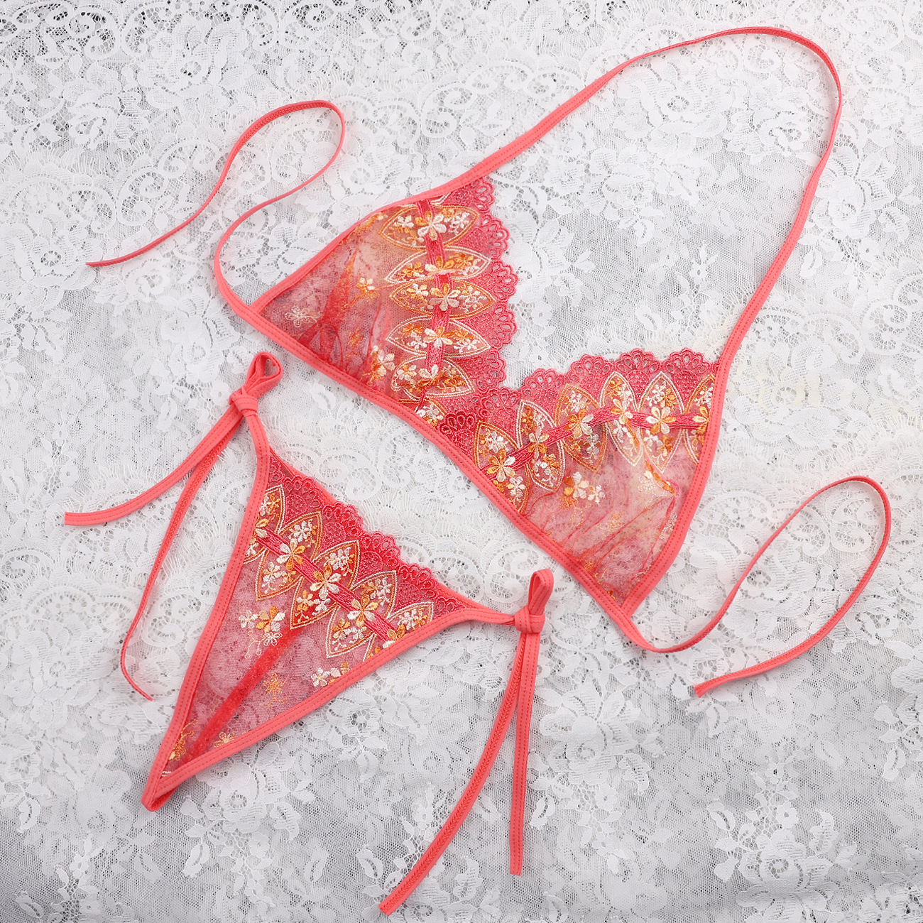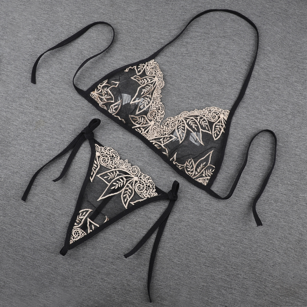 Трансграничная фабрика нового продукта Вышивка Цветочная забавная трехточечный костюм Прозрачный сетчатый ремешок Нижнее белье