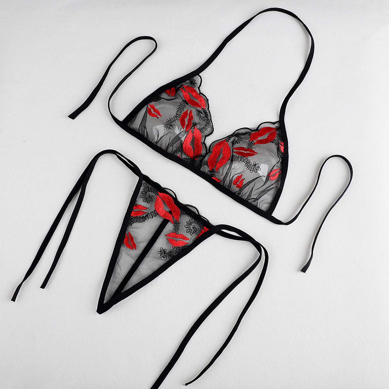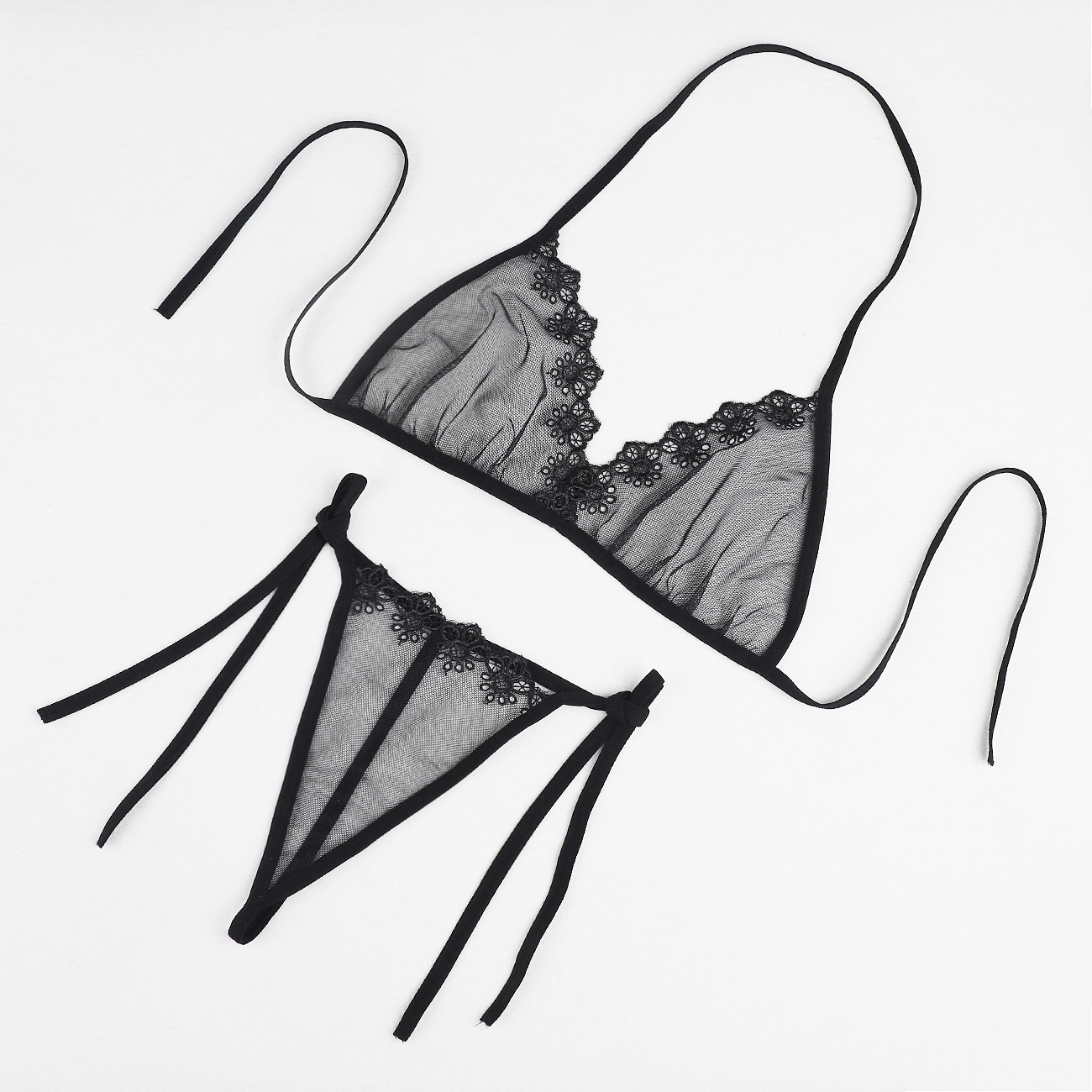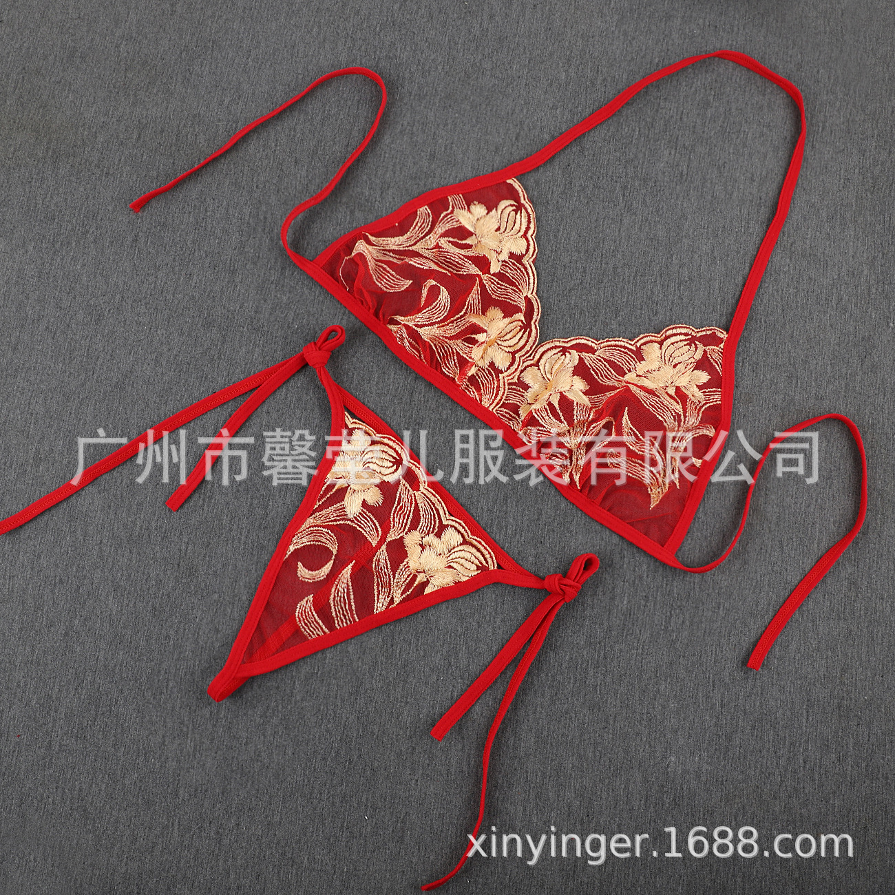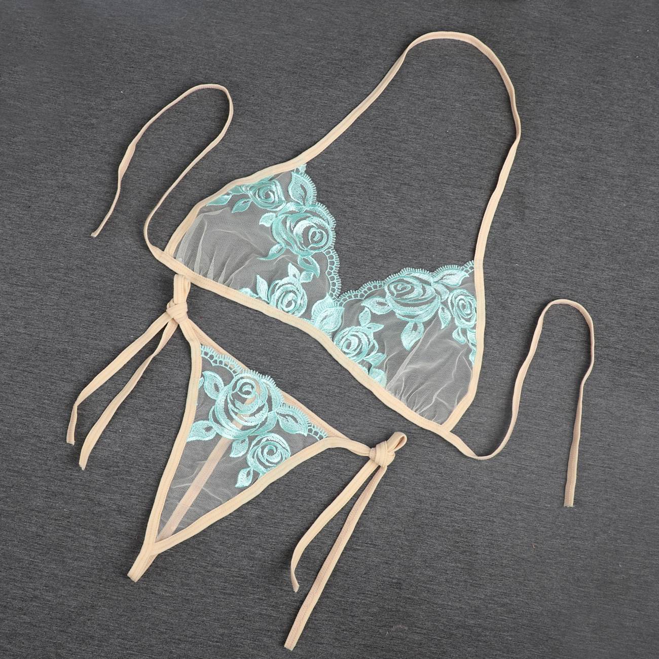Трансграничная фабрика нового продукта Вышивка Цветочная забавная трехточечный костюм Прозрачный сетчатый ремешок Нижнее белье