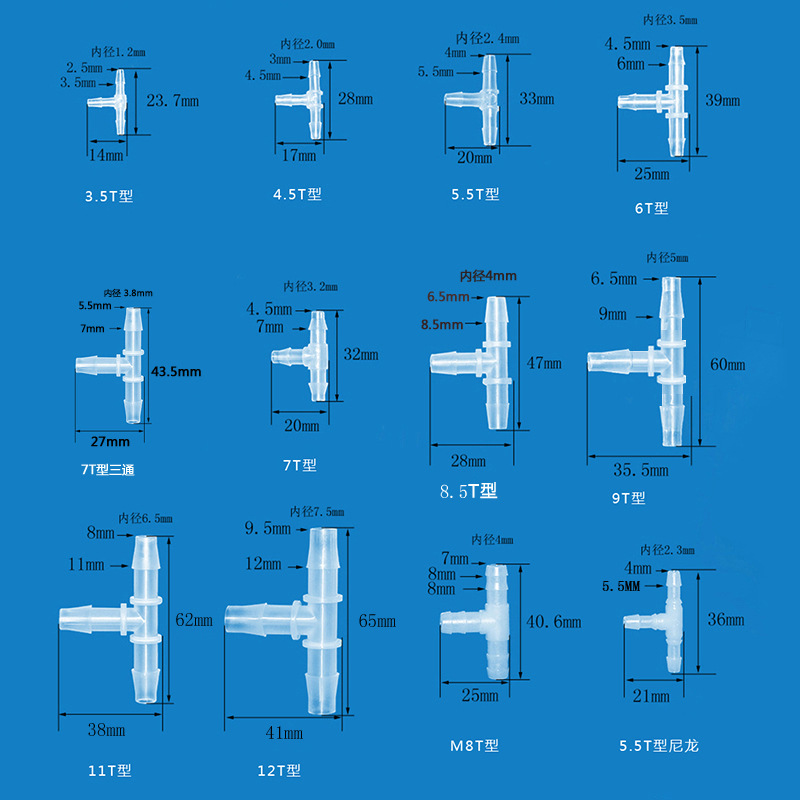 我司生产各种规格型号的塑料直通接头、三通接头、弯头、变径三通接头、四通接头。有T型三通、Y型三通、十字4通、土字型5通、直通等。产品使用的材料有以下几大类:PP、ABS 、PE、PA{尼龙} 、POM【聚甲醛】不同材料有不特性。应用范围也比较广,相比金属材质性价比高,同时具有环保无污染的特点。多应用在机械设备排污排水、电器管路、美容医疗器械、吸氧机、新式家用小电器、低压小气管连接、园林喷水喷灌、汽车管路连接等等。