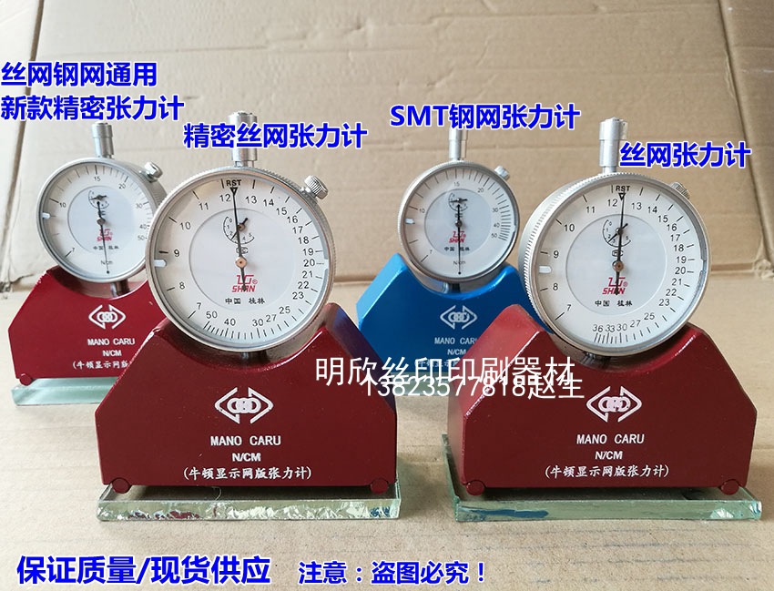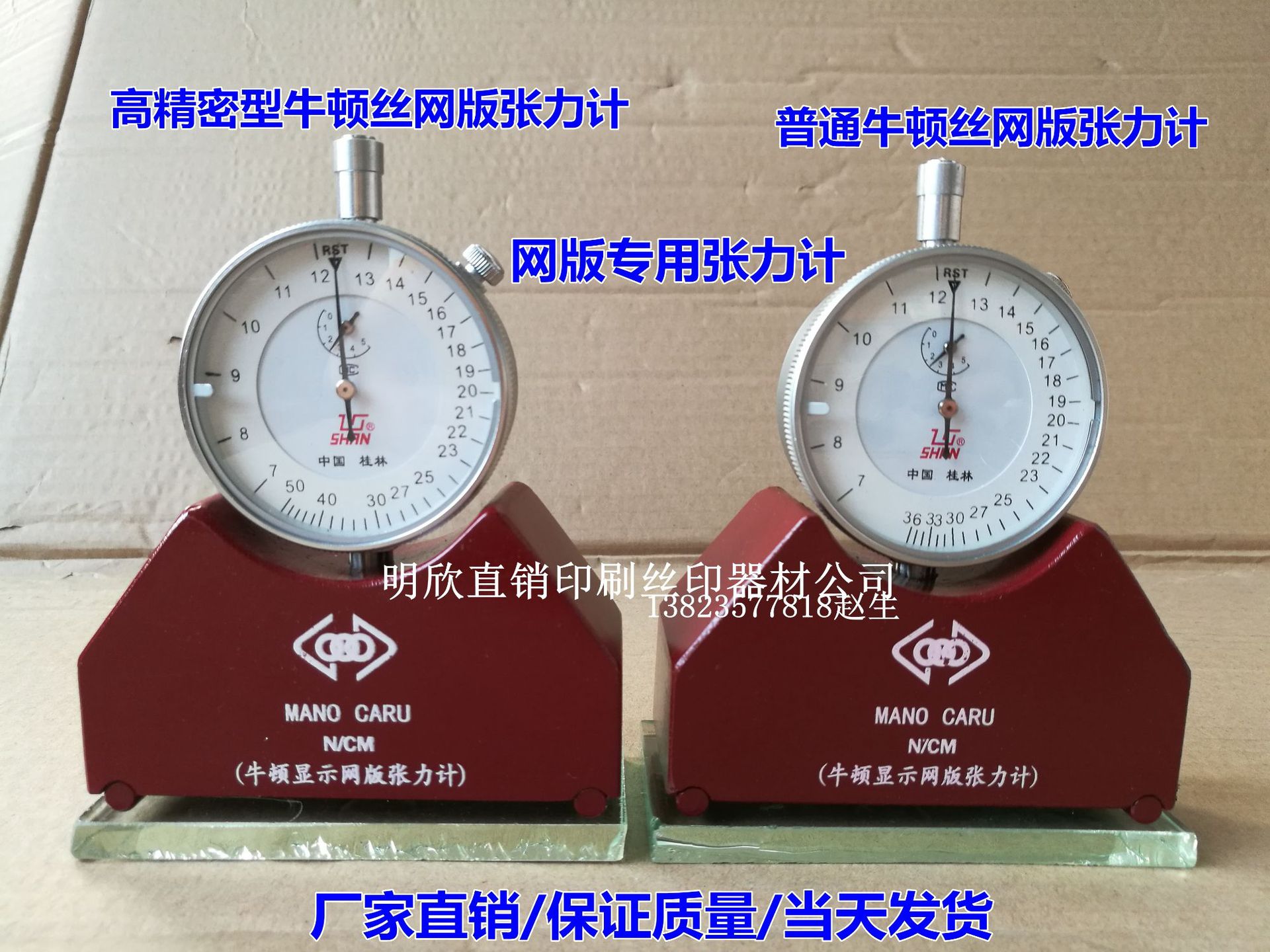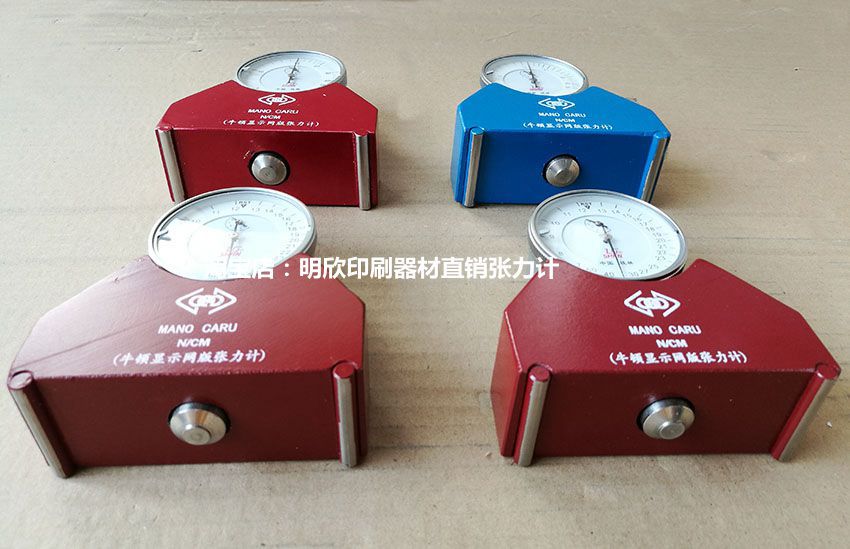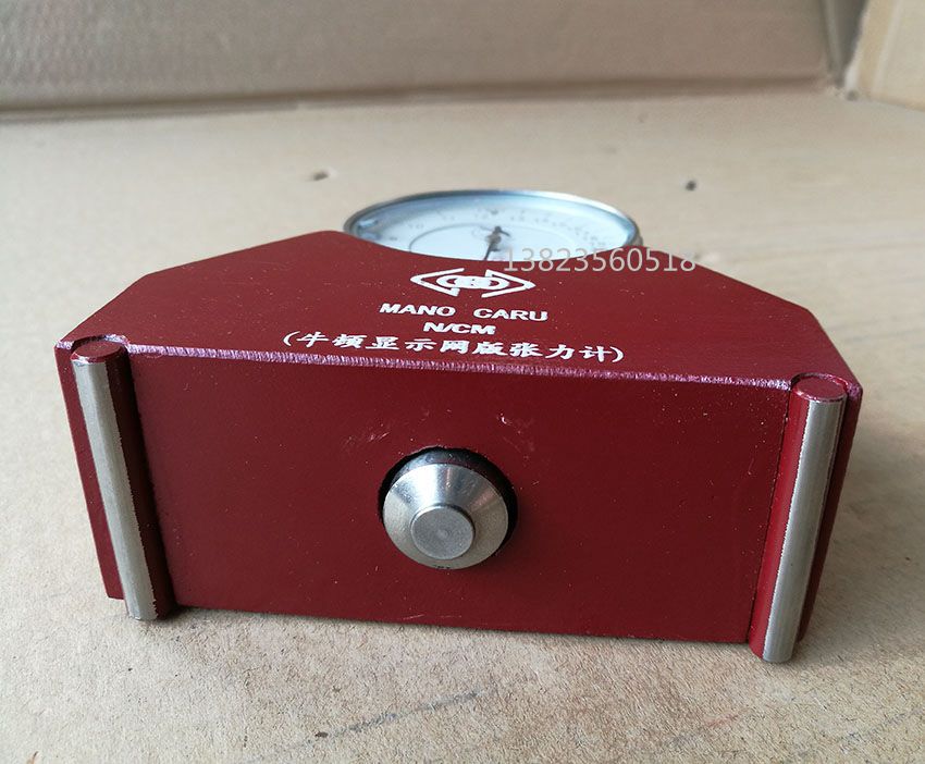 张力计是测控绷网时的张力,是绷网过程中不可或缺的张力测量器,选择高精密度的张力器是制版及套印的关键。张力计操作简单方便 易读取数据 误差小精确度高张力仪是测量丝网受到拉力作用时其内部与固定丝网接触体之间的相互牵引力大小的仪器。测量张力的单位用牛顿/厘米表示。张力也可以用相对数值来表示。厘米张力仪就是用相对数值表示张力的一种,是通过张力仪自身重量使丝网下沉的深度的数值(毫米)来计算,张力数值可从指示盘上直接得到,或者从控制盘上间接得到。张力仪是检验丝网印版质量的重要的检测仪器。为保证得到制版要求的张力,在绷网过程中或绷网后都要使用张力仪测量