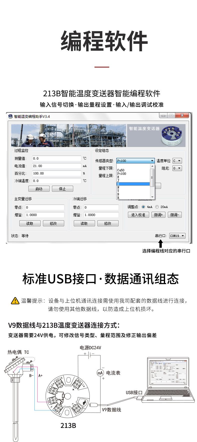 【213B】Датчик температуры; 【213】Датчик температуры; Линия программирования V9 (при использовании передатчику требуется источник питания 24 В) + программное обеспечение; Линия программирования V8 (при использовании передатчику не требуется источник питания 24 В) + программное обеспечение