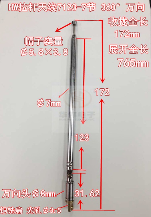 HW拉杆天线7123-7节 360°万向(收音机、电视机、玩具、仪器专用)