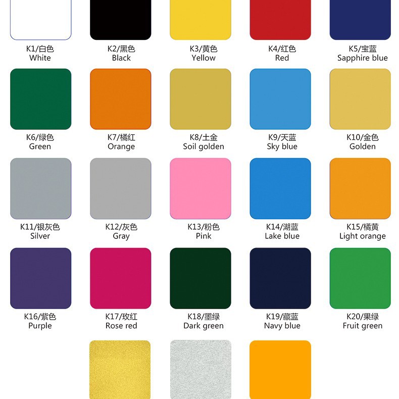 K1 белая липкая спинка; K2 черная липкая спинка; К3 желтая липкая спинка; К4 красная липкая спинка; K5 королевский синий с липкой спинкой; K6 зеленая липкая спинка; K7 оранжево-красная липкая спинка; Золото почвы K8 возвращается липким; K9 небесно-голубая липкая спинка; K10 золотая липкая спинка; K11 серебристо-серая липкая спинка; K12 серая липкая спинка; K13 розовая липкая спинка; K14 озерно-синий липкая спинка; K15 оранжево-желтая липкая спинка; K16 фиолетовая липкая спинка; K17 розово-красная липкая спинка; К18 темно-зеленая липкая спинка; K19 темно-синий с липкой спинкой; K20 фруктово-зеленая липкая спинка; К22 золото; К23 серебро; К24 Куркума; k25 флуоресцентный желтый; К26 флуоресцентный оранжевый; К27 флуоресцентный зеленый; Флуоресцентный порошок К28; К29 флуоресцентный фиолетовый