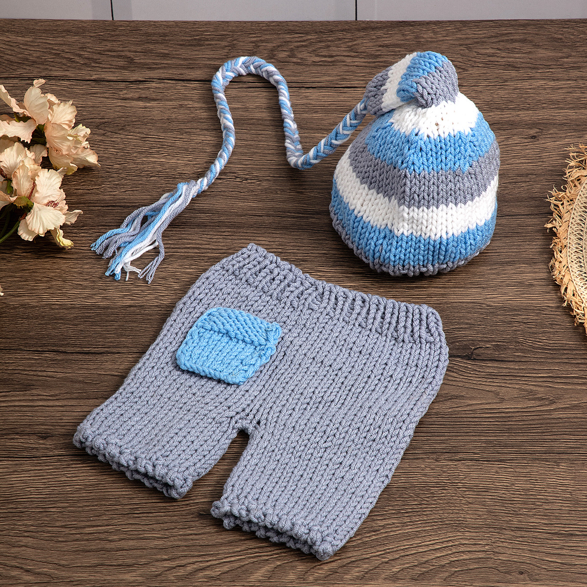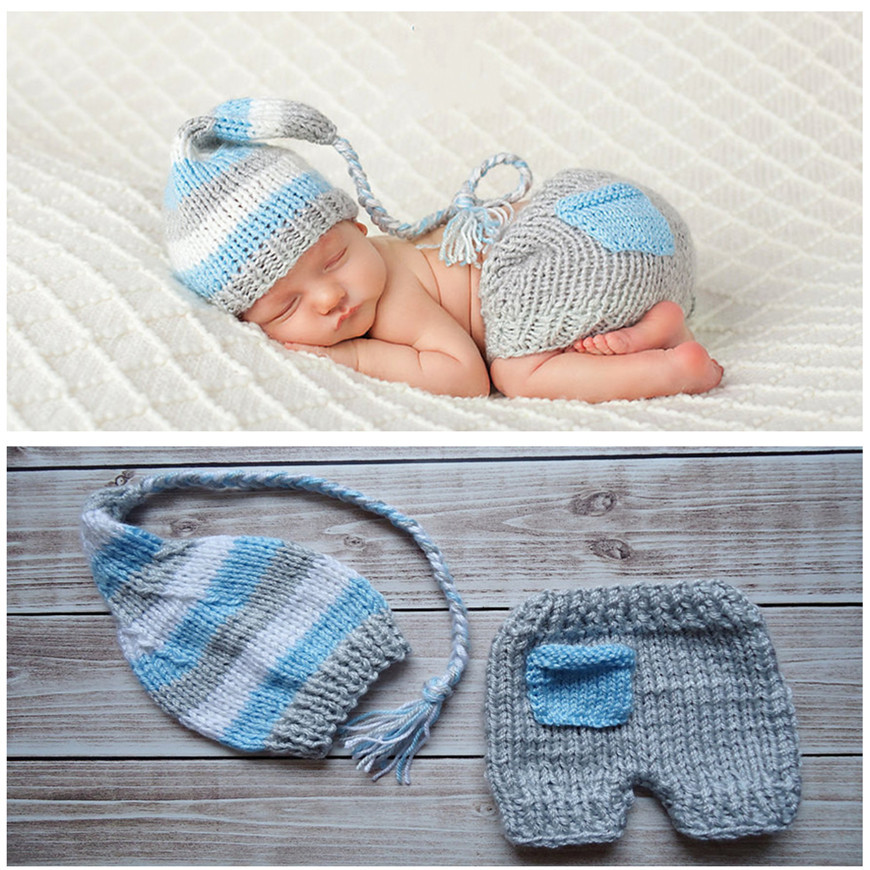 名称:奶棉棒针婴儿童套装新生儿摄影服手工编织长尾帽和可爱的裤子新款