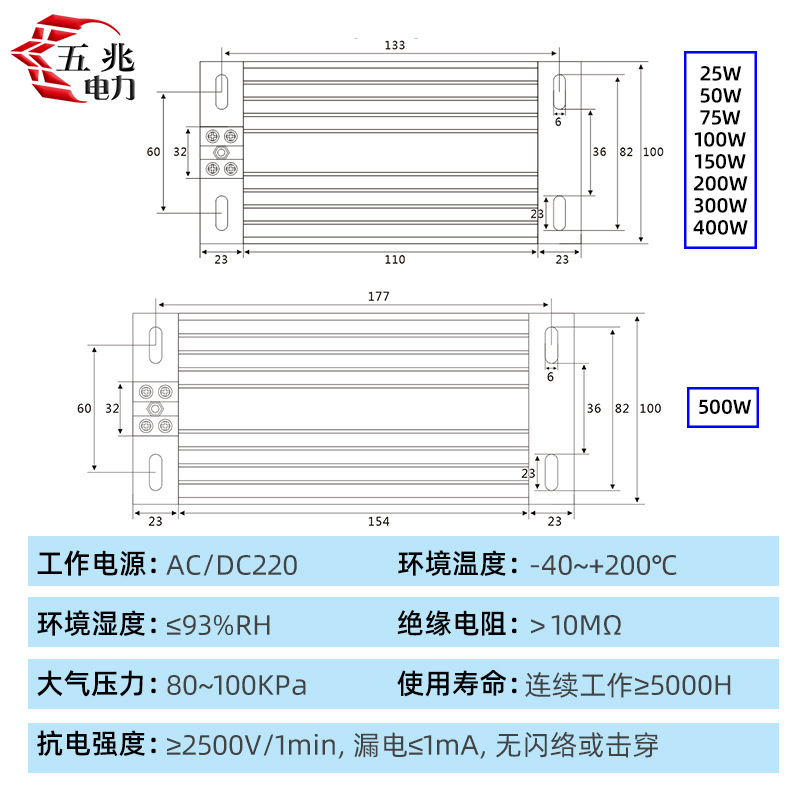 25 Вт; 50 Вт; 75 Вт; 100 Вт; 150 Вт; 200 Вт; 300 Вт; 400 Вт; 500 Вт