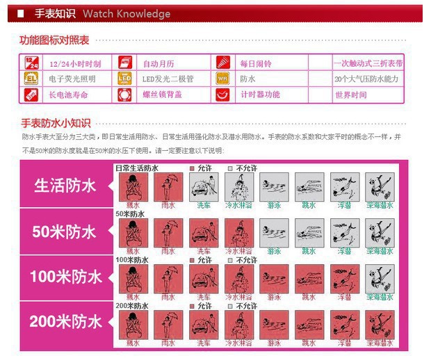 手表作为高精密计时仪器及艺术饰品,正确的使用及保养至关重要,能够延长手表使用寿命与精密度以及外观件的美观,使其更方便您的工作与生活。 1、关于外观件保养 (1)表壳与表带:手表的表壳表带的的材质为很多种,如钨钛合金、高科技陶瓷、不锈钢、软纤维、普通钢质等,佩带时尽量避免与超过或相同硬度的特体摩擦、碰击。定期清洗表壳表带也十分必要,另外海水、盐水浴、香水、洗发精、指甲油、洗甲水和一些含化学物质的化妆品等对手表的镀金层及金属面有一定腐蚀,应避免接触。 (2)表镜:手表的表镜基本可分为合成水晶胶、矿物玻璃、蓝宝石水晶玻璃。合成水晶胶的耐磨性稍差易出划痕、但耐撞击力较强;蓝宝石水晶玻璃搞磨损程度,但材质较脆怕猛烈的撞击;矿特质玻璃介于两者之间。即使抗磨损的蓝宝石水晶玻璃也应物别注意钻石、磨石、砂纸、指甲锉、花网石面、混凝土墙面等中所含的杂质,以免刮伤其表面。 2、关于手表防水 30米防水:是指生活防水、洗手、洗脸、淋雨、车溅水等。 50米防水:适用于渔业、洗车、淋浴、游泳等。 100米以上防水:适用于潜水、潜游等。手表表镜、表壳和表带-手表保养常识