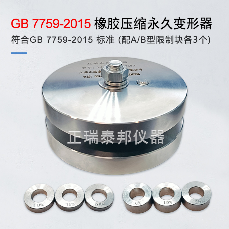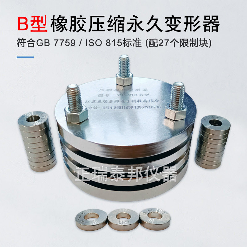 ZB-918型 橡胶压缩永久变形器由平行钢板、限制器和紧固件组成, 用于硫化橡胶,热塑性橡胶在常温,高温条件下,以一定压缩率,经一定的压缩时间后测定橡胶变形量。