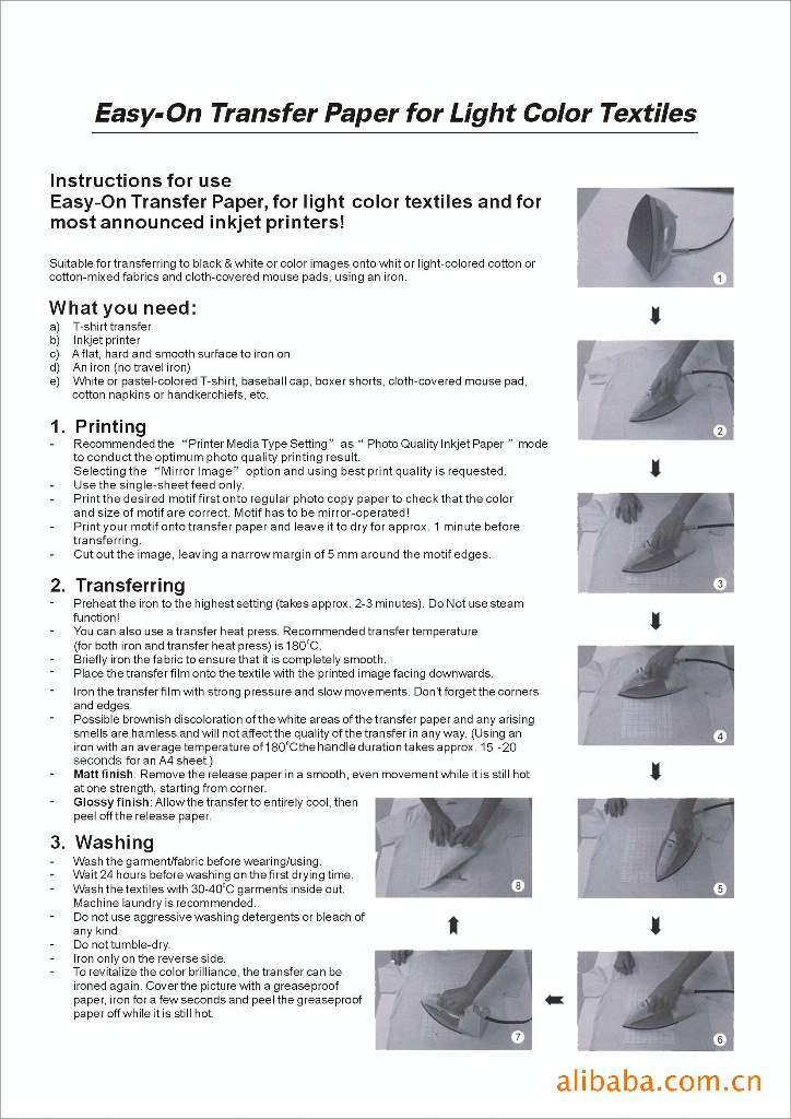 1. 请在烫印24小时后保持干燥,再进行第一次洗涤。