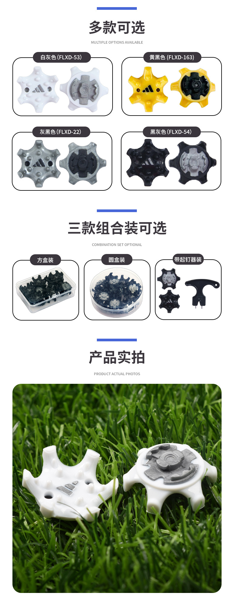 Белый серый одинарный (FLXD-53); Серо-черный одинарный (FLXD-22); Черно-серый одинарный (FLXD-54); Жёлто-чёрный одиночный (FLXD--163); 16 штук в квадратной коробке (FLXD-53); 18 штук в круглой коробке (FLXD-53); 16 штук в квадратной коробке (FLXD-22); 18 штук в круглой коробке (FLXD-22); 16 штук в квадратной коробке (FLXD-54); 18 штук в круглой коробке (FLXD-54); 16 штук в квадратной коробке (FLXD-163); 18 штук в круглой коробке (FLXD-163); 20 шипов для обуви с простым ключом (FLXD-53); 30 шипов для обуви с простым ключом (FLXD-53); 50 шипов для обуви с простым гаечным ключом (FLXD-53); 20 шипов для обуви с простым ключом (FLXD-22); 30 шипов для обуви с простым ключом (FLXD-22); 50 шипов для обуви с простым ключом (FLXD-22); 20 шипов для обуви с простым ключом (FLXD-54); 30 шипов для обуви с простым гаечным ключом (FLXD-54); 50 шипов для обуви с простым ключом (FLXD-54); 20 шпилек для обуви с простым ключом (FLXD-163); 30 шипов для обуви с простым ключом (FLXD-163); 50 шпилек для обуви с простым ключом (FLXD-163)