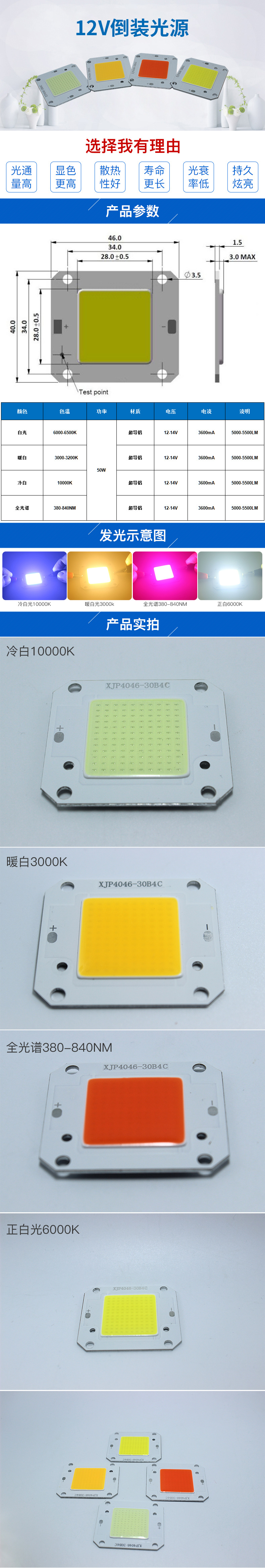 Светодиодный мощный 12V50W перевернутый COB интегрированный источник света белый свет теплый свет холодный белый свет полный спектр многоцветный опционально