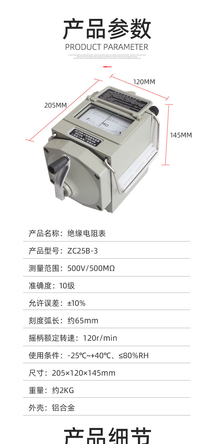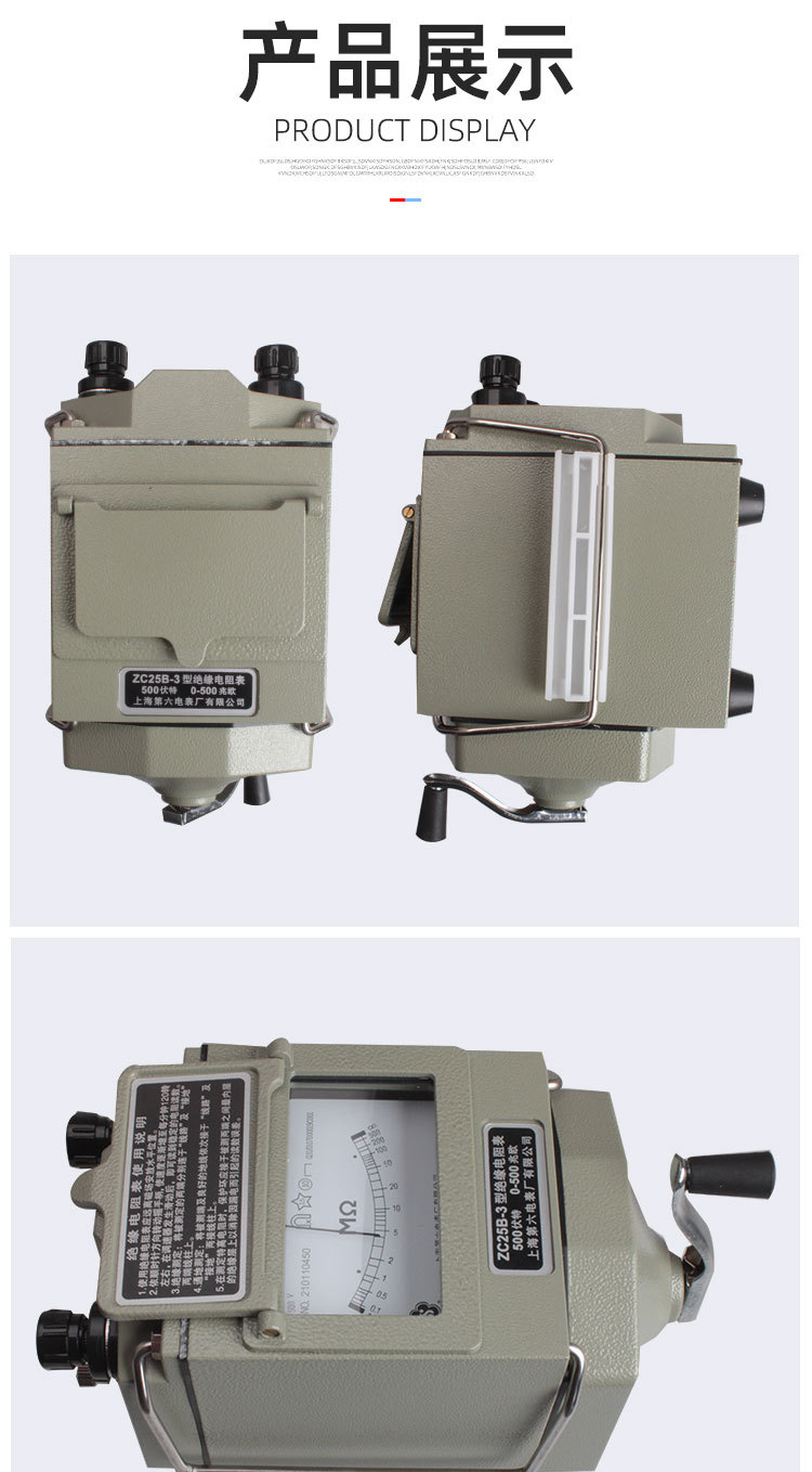 ZC-7 500V/500M; ZC-7 1000V/1000M; ZC-7 2500V/2500M; ZC-7 2500V/5000MΩ; ZC-7 5000V/5000M; ZC-7 10000V/10000M; ZC25B-2 250V 250M; ZC25B-3 500V/500M; ZC25B-4 1000V/1000M; ZC11D-10 2500V/2500M