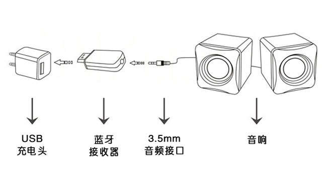 把蓝牙U盘直接插入音箱USB接口,然后把音频连接线连接到AUX端口